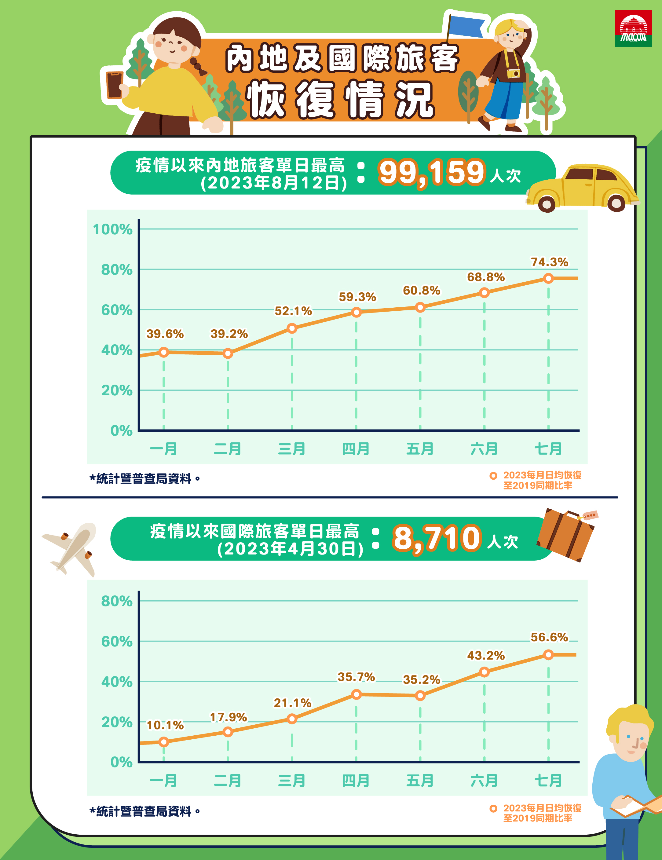 Since Macao lifted its travel restrictions at the beginning of this year, the Macao Government Tourism Office (MGTO) immediately launched promotion works in various tourist source markets, profusely carrying out promotions both online and offline, combining public and private forces and fascinating events every month, influencing a steady increase on the number of visitors; during summer season, the number of inbound visitors in Macao has further increased and the number of visitors has improved significantly.