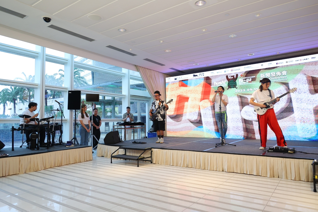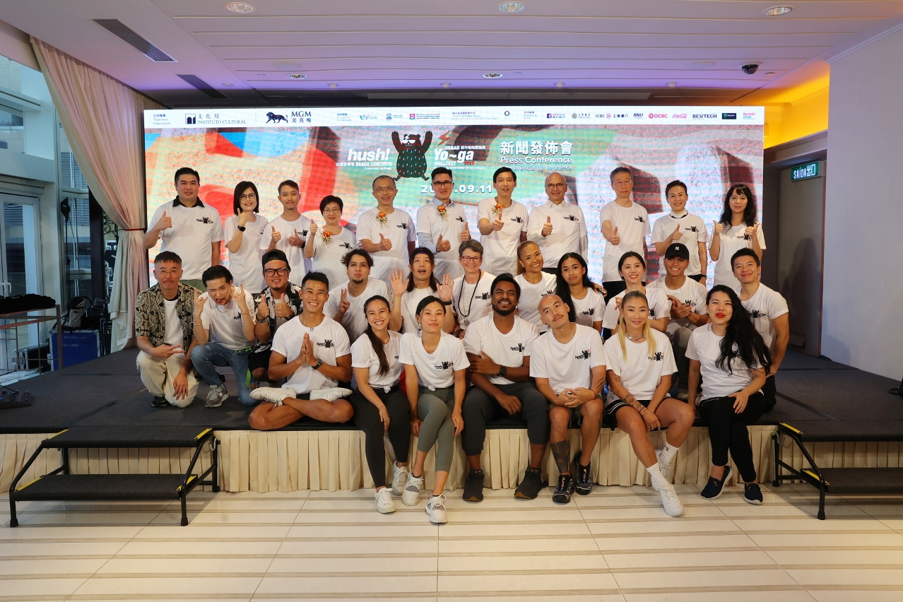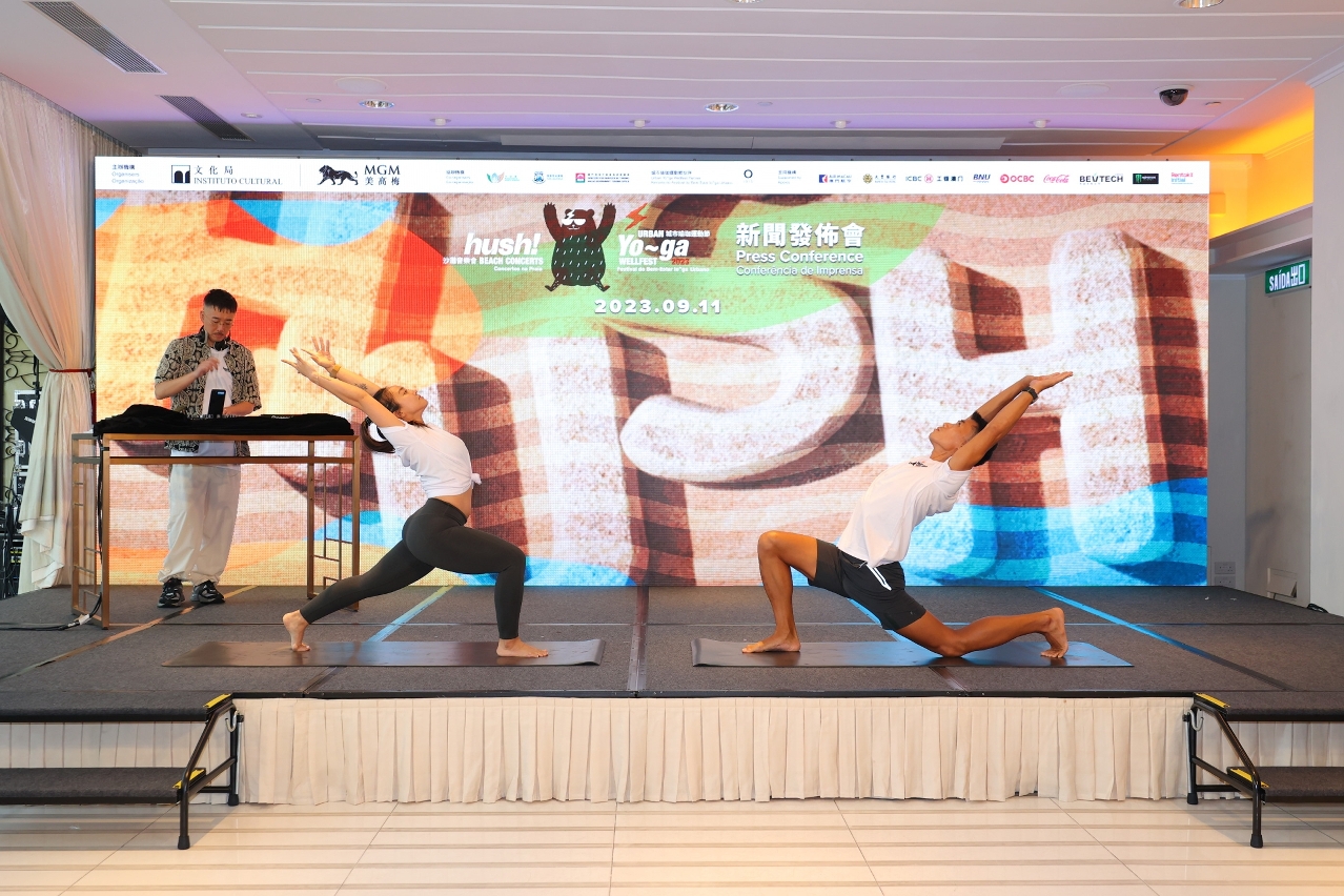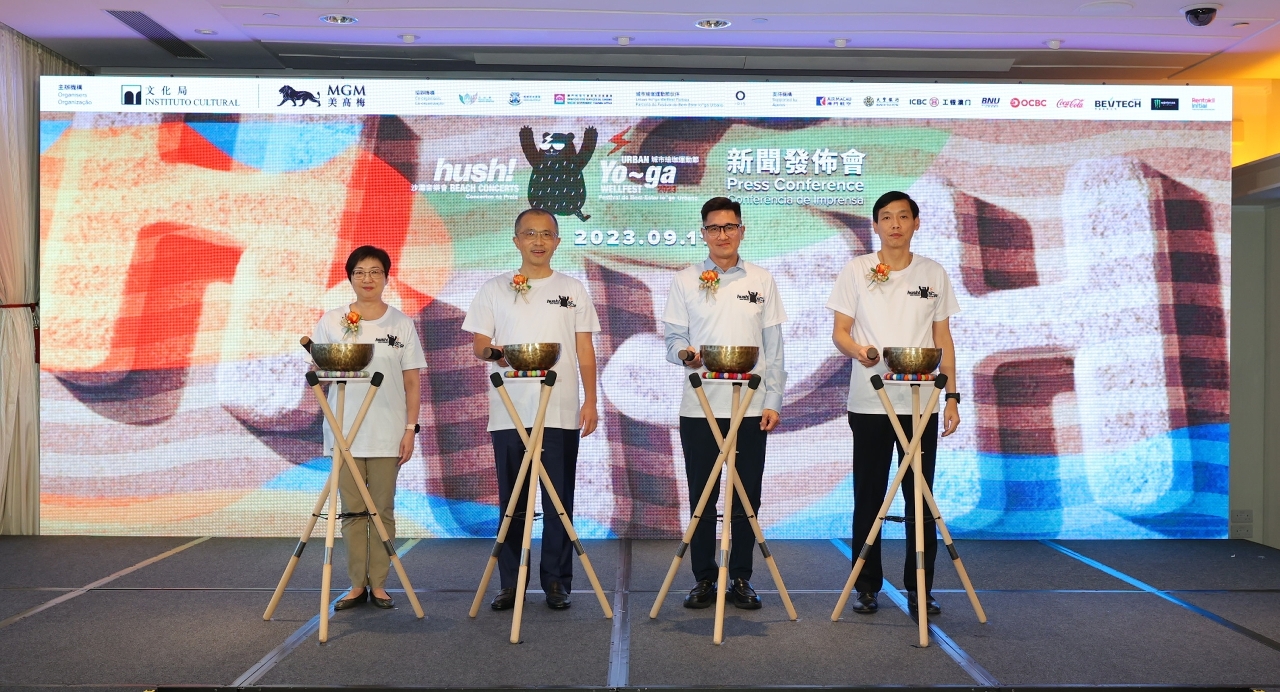 The press conference of the “hush! Beach Concerts x Urban Yo~ga Wellfest 2023” was held on 11 September at MGM Macau, and was attended by the Vice President of the Cultural Affairs Bureau, Cheang Kai Meng; the President and Executive Director of MGM China Holdings Limited, Kenneth Feng; the Acting Director of the Macao Government Tourism Office, Hoi Io Meng; and the Head of Department of Cultural and Recreational Affairs and Civic Education of the Municipal Affairs Bureau, Patsy Ko Pui San. Local band Scamper, DJ Ghostly Park, and SUP yoga instructors Jessica Lee and Victor Chau alsoperformed at the same venue.