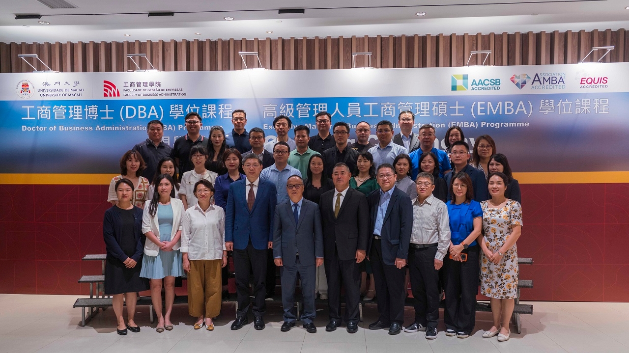 The Faculty of Business Administration (FBA) of the University of Macau (UM) held an opening ceremony for the 2023/2024 intake of the Doctor of Business Administration (DBA) programme and the Executive Master of Business Administration (EMBA) programme. The two programmes have admitted more than 60 business elites from Macao and mainland China for the new academic year.