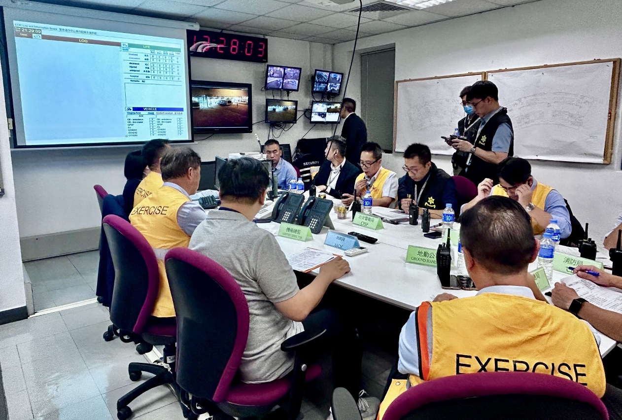 The exercise took place between 21:00 to 23:30 last night. The scenario started with the detection of suspected explosives in the hand carry baggage of a transit passenger by the security inspectors during the screening procedures in the transit corridor of the passenger terminal. The security inspectors requested the passenger to open the baggage for further inspection. The passenger left the baggage and immediately fled. The security inspectors tracked the passenger, reported the case to the senior management and the police. The security inspectors eventually caught the passenger and explosive substances was found in the baggage after checking. Upon receipt of the notification, the airport police sent policemen to the site, cordoned off the area and located the other transit passengers to another zone for inspection. In view of the crisis level of the incident, Macau International Airport declared emergency and activated the Emergency Operations Centre. All involved government entities and the airport operators arrived at the centre to handle the crisis in joint efforts.