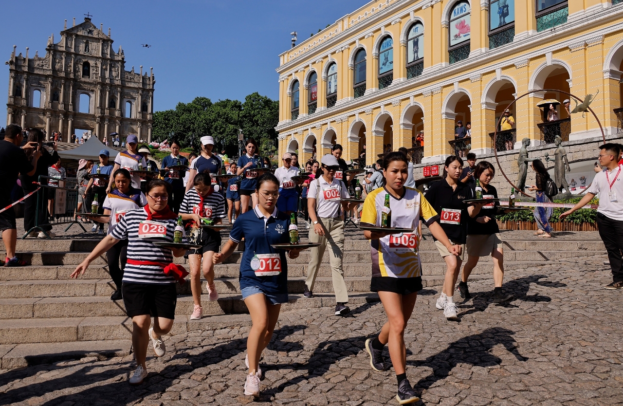 Upon the sound of the air horn, the special guest contestant, Macao Tourism Mascot MAK MAK in the outfit for Macao Courtesy Campaign, joined the other contestants to set off from the Ruins of St. Paul’s, each balancing a bottle of Macau Beer on their tray. They ran down the lanes through the Historic Centre of Macao and delivered the beer safely to the finish line at Senado Square the fastest they could. The Race was filled with excitement, attracting visitors which took photos and cheered for the contestants on the way. The event manifested the charm of the destination.