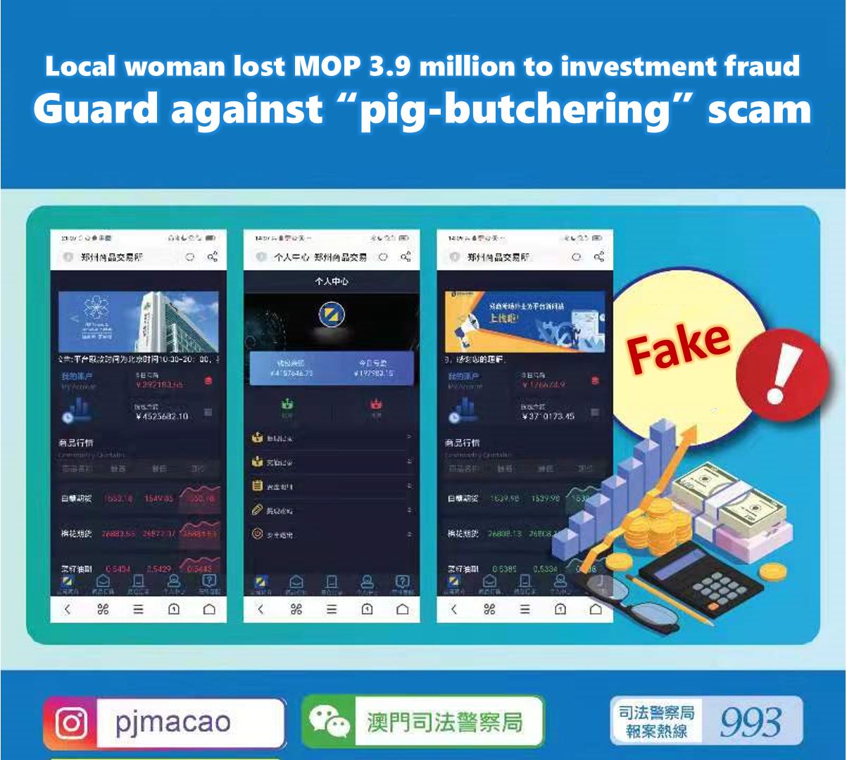 The Judiciary Police (PJ) received a report of an online investment scam where the victim met a self-proclaimed “Regimental Commander of the National Army” through a karaoke chat app. Following the swindler’s instructions, the victim made multiple investments. When the latter discovered she could not withdraw money, she suspected fraud and alleged she had lost approximately MOP3.9 million.