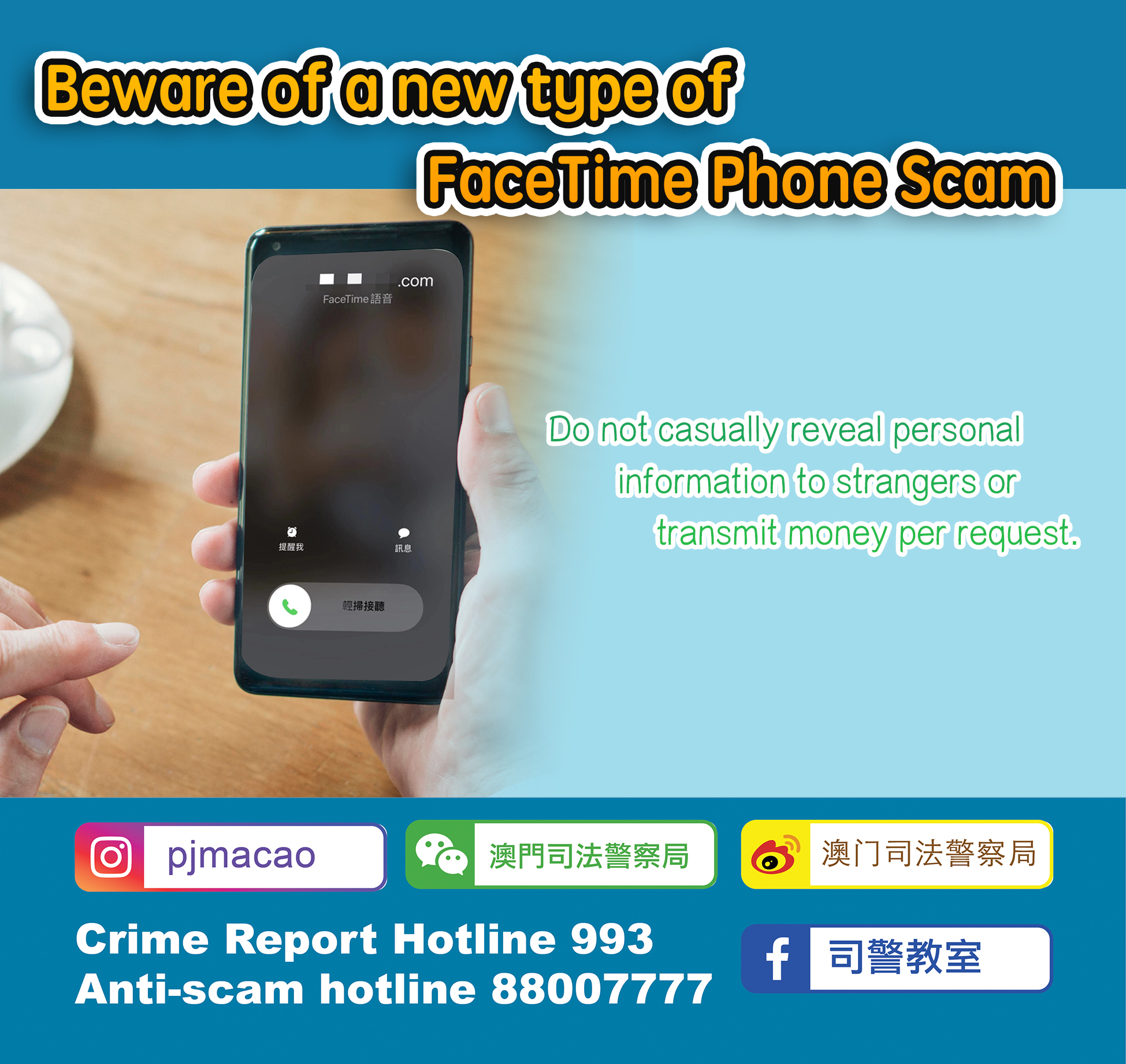 The Judiciary Police’s Anti-Fraud Coordination Center reminds the public to remain vigilant when receiving FaceTime requests from persons unknown. Never readily believe in the identity proclaimed by the unacquainted caller and give away personal information or remit money. Instead, they should always check with the company or organization through official channels.
