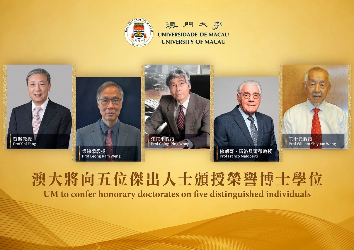 The University of Macau (UM) will hold the Ceremony for the Conferment of Honorary and Higher Degrees 2023 on 2 December (Saturday), where honorary doctorates will be conferred on five distinguished individuals: Cai Fang, Leong Kam Weng, Ching-Ping Wong, Franco Maloberti, and William Shiyuan Wang. Doctoral and master’s degrees will also be awarded on the occasion.