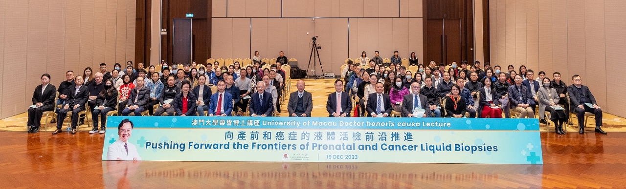 The University of Macau (UM) held a Doctor honoris causa Lecture today (19 December). Dennis Lo Yuk Ming, honorary doctor of UM, gave a talk titled ‘Pushing Forward the Frontiers of Prenatal and Cancer Liquid Biopsies’ to discuss the current and future developments of the field of liquid biopsy. The event attracted many experts, scholars, industry practitioners, researchers, as well as UM faculty members and students.