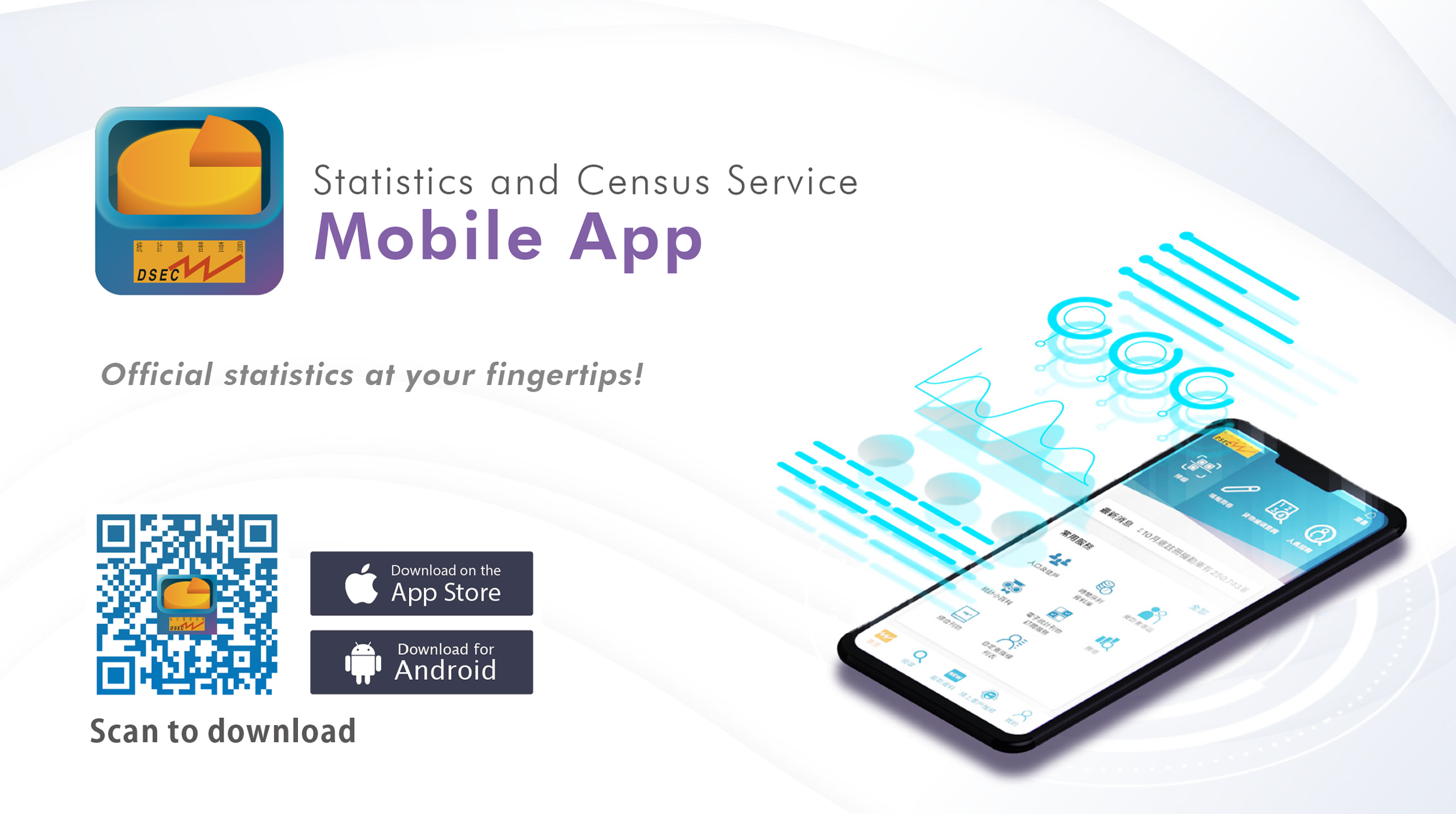 The revamped app, which supports traditional and simplified Chinese, as well as Portuguese and English, is available for download in Apple App Store and Google Play Store by searching “Statistics and Census Service”. DSEC will continue to improve the mobile app to provide the public with more convenient and faster access to official statistical services.
