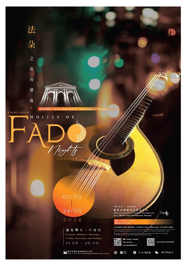 Organised by the Cultural Affairs Bureau (IC, from the Portuguese acronym), the “Fado Nights” concerts will be held on Fridays, Saturdays and Sundays, from 1 to 24 March, from 7pm to 8pm, at the Dom Pedro V Theatre, featuring a total of 12 traditional fado performances. Tickets will be on sale through the Macau Ticketing Network, as well as Damai (Mainland China) and Cityline (Hong Kong) platform from 1 February.