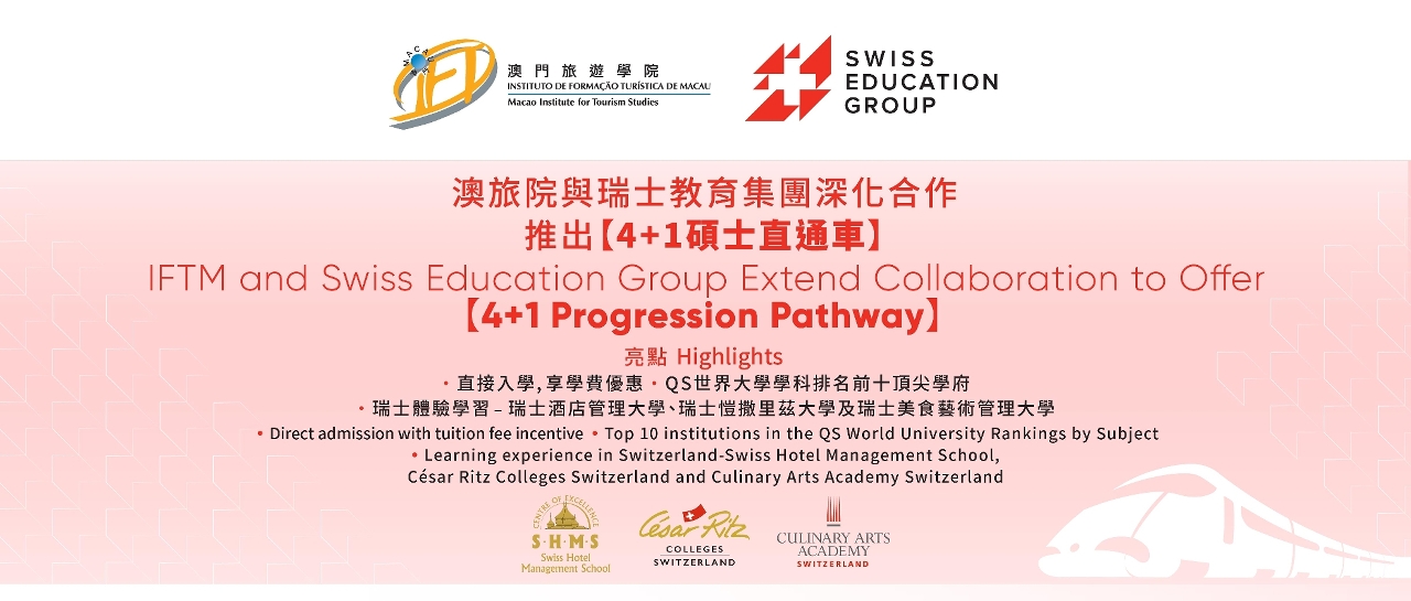 The Macao Institute for Tourism Studies (IFTM) proudly launches the “4+1 Progression Pathway” in collaboration with Swiss Education Group (SEG), providing direct admission opportunities to IFTM students who are interested in pursuing further studies abroad.
