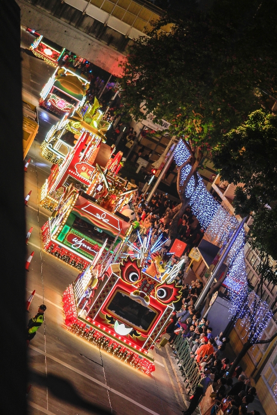 Enlivened by a large-scale lion dance performance, the procession set off from the University of St. Joseph and St. Joseph Diocesan College Six, marching forth and engaging spectators who cheered along the way until the destination at Iao Hon Market Garden, where a wonderful artistic and cultural show was presented by MGM, Wynn Macau, Limited, Galaxy Entertainment Group, SJM Resorts, S.A., Sands China Ltd., Melco Resorts & Entertainment Limited and Chimelong Group. Hong Kong artists Selena Lee and Carman Kwan, Macao singers Germano Guilherme, Rico Long and Viviana Lo also delivered fantastic performances and welcomed the floats together with residents and visitors. The parade route abounded with flows of people with great atmosphere.
