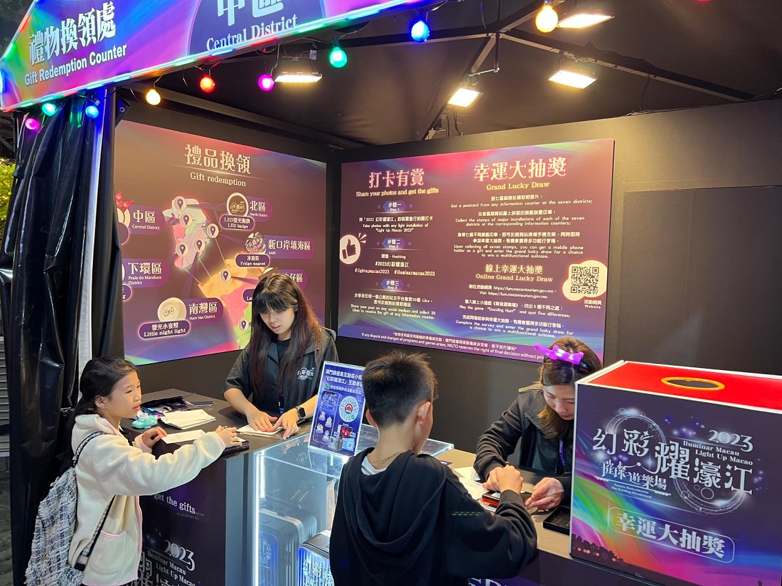From 2 December 2023 to 25 February 2024, MGTO compiled statistics about the number of people who visited the seven districts with installations and mapping shows during Light up Macao 2023, through mobile data provided by local telecommunication companies. A total of 7.78 million people visited the above districts. In addition, close to 40,000 souvenirs were presented on site during the event. About 1,500 people collected all the stamps from seven districts and joined the grand lucky draw. Over 10,000 people played the online game “Explore the Wonderland”, while the interactive game “Light up Macao 2023” on MGTO’s WeChat MiniProgram engaged nearly 520,000 participants, among which over 54,000 people took part in the lucky draw.