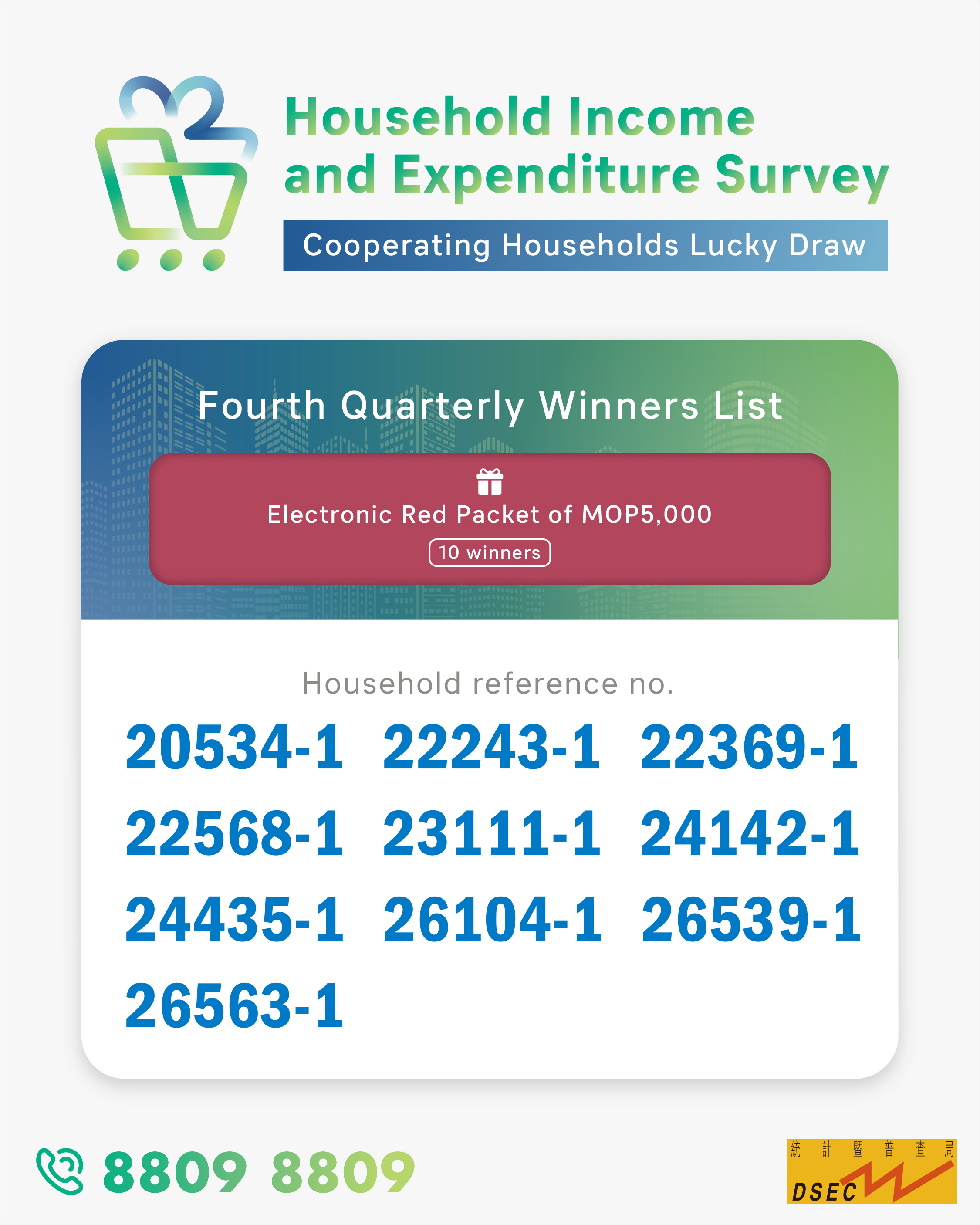In appreciation of the support and cooperation from the households, all households that complete the survey will receive completion incentives and will automatically enter the “Cooperating Households Lucky Draw” to win an electronic red packet of MOP5,000.
