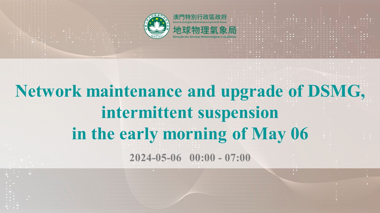 The network system of DSMG will undergo maintenance and upgrade on May 6th (Monday) between  12a.m. and 7a.m. Please kindly be informed that during this period, there will be intermittent delays in certain information dissemination services. The 1311 telephone system inquiry service will also experience intermittent interruptions. Services will return to normal once the maintenance and upgrade work is completed. We apologize for any inconvenience caused.
