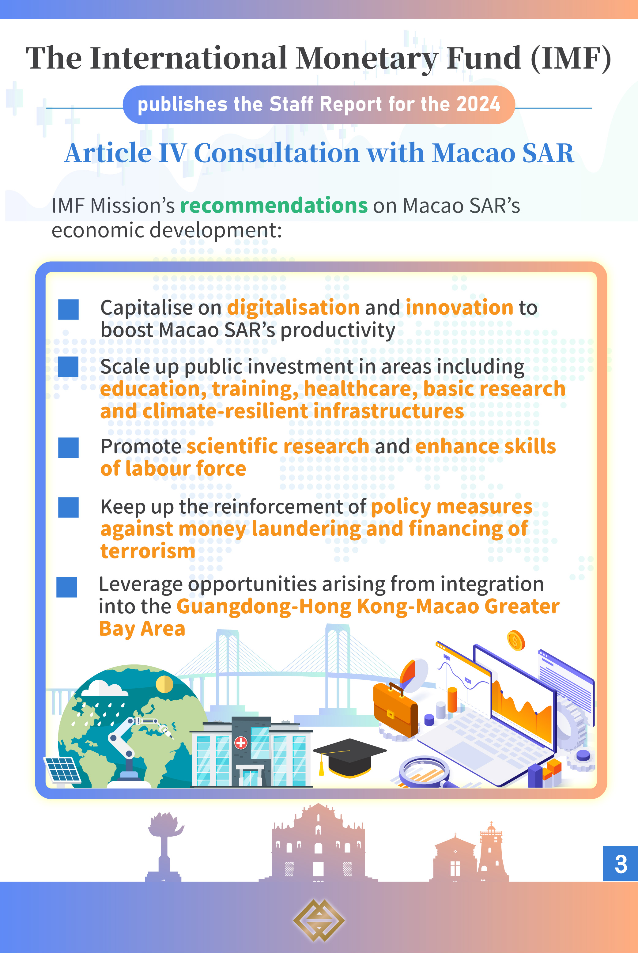 The IMF stated that Macao’s economy had witnessed a significant advancement in terms of digitalisation. Meanwhile, the IMF suggested the SAR Government to scale up public investment in areas including education, training, healthcare, basic research and climate-resilient infrastructures, as well as to support digital transformation of small- and medium-sized enterprises, which would in turn enhance Macao’s productivity and resilience against economic shocks. In addition, the IMF recommended the SAR Government to leverage opportunities arising from integration into the GBA, so as to forge ahead with the policy objectives of appropriate economic diversification in Macao SAR.