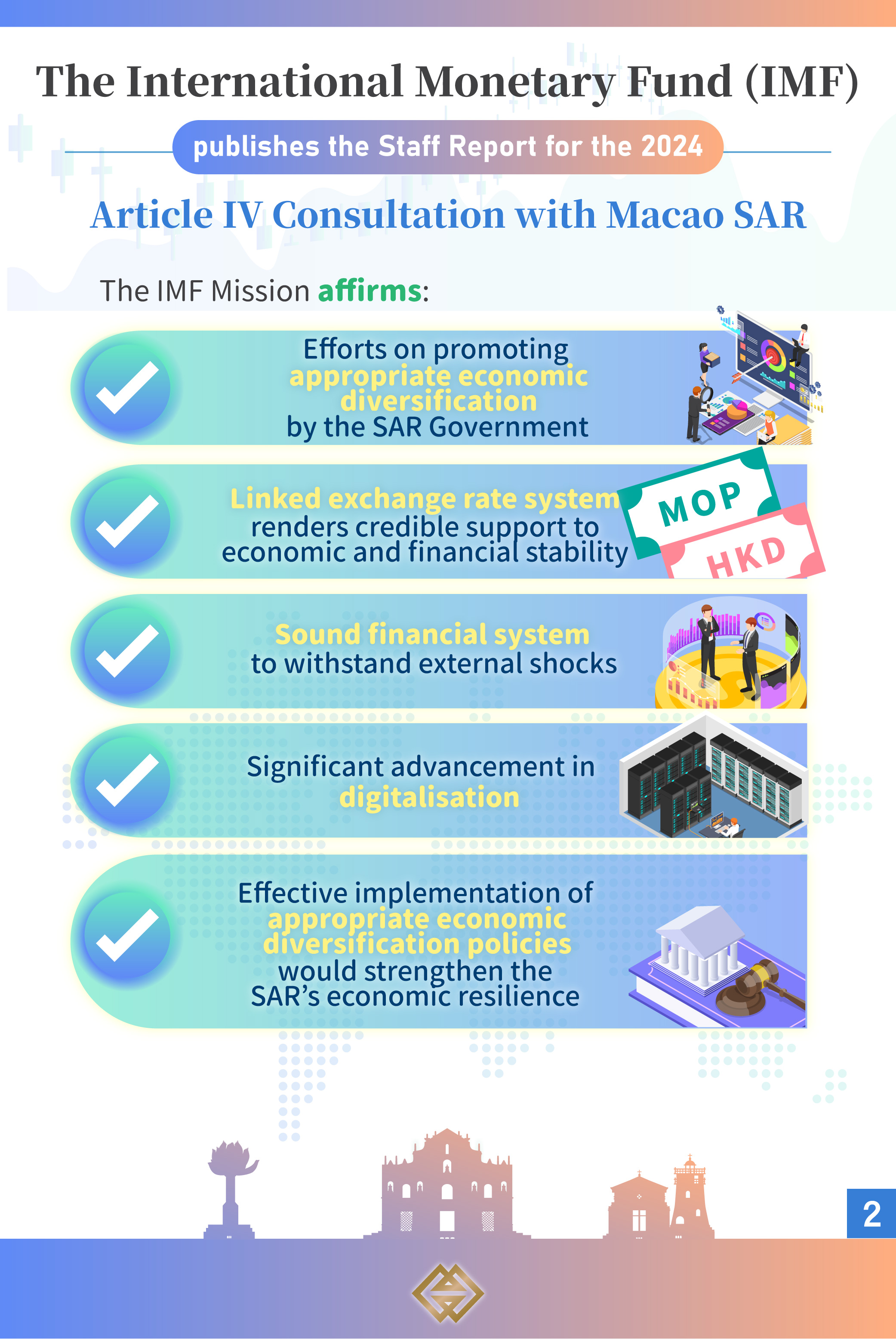 The IMF reaffirmed that the linked exchange rate system (LERS) between the Macao pataca (MOP) and the Hong Kong dollar (HKD) had rendered credible support to Macao SAR’s economic and financial stability. Meanwhile, key factors such as stringent fiscal discipline, a sound banking system, adequate foreign exchange reserves and a flexible labour market, would underpin the effective operation of the LERS.