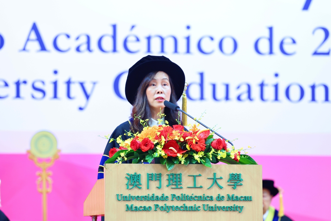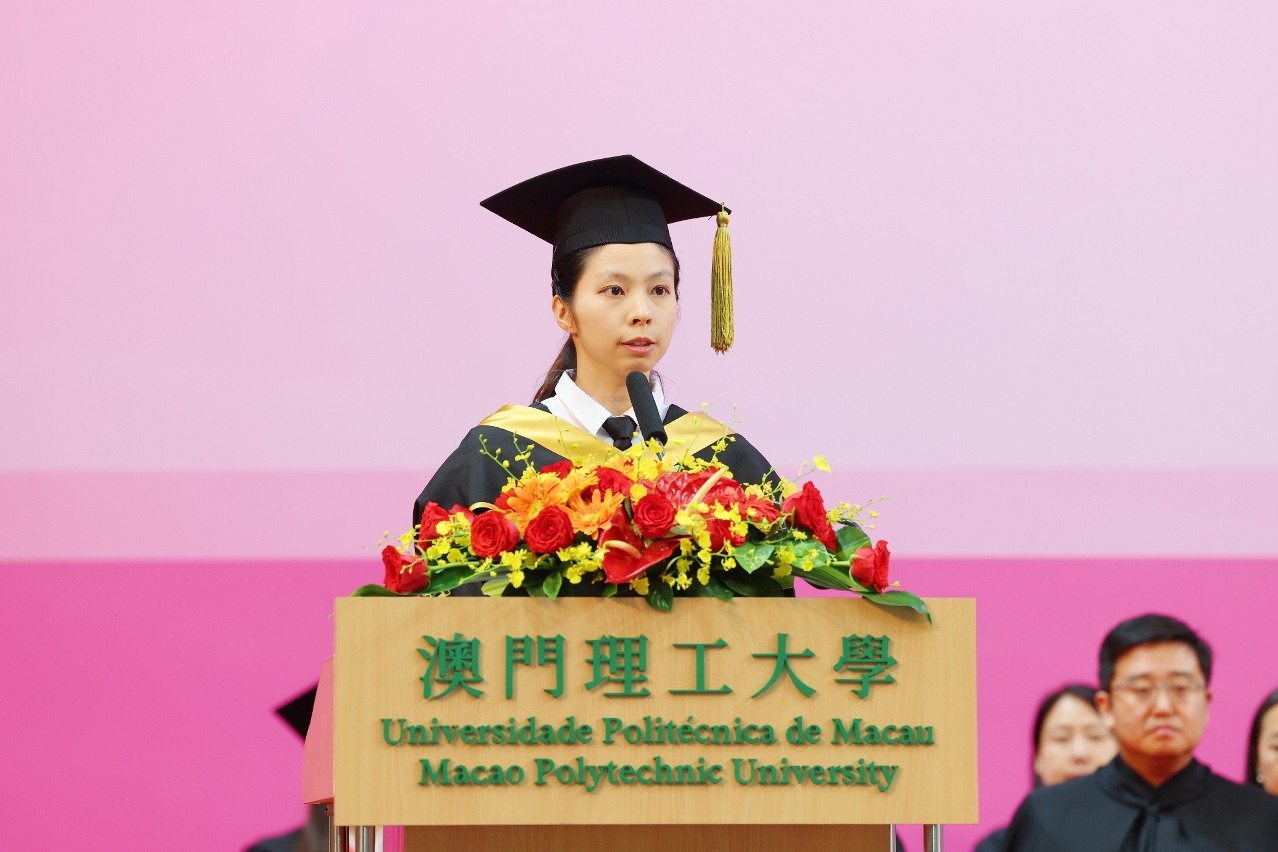 Graduate representative Sou Cho Man, a Master of Sports and Physical Education, delivered a speech of gratitude, thanking the Macao SAR government for supporting the cultivation of young talents through continuous improvement of educational infrastructure, enhancement of teaching quality, comprehensive youth policies, and promotion of patriotic education, all contributing to the holistic development of young people. She expressed gratitude for the comprehensive education provided by MPU, the dedicated teaching of professors, the companionship of classmates, and the unwavering support of family members. She encouraged graduates to forge ahead, seize opportunities, look to the future, and contribute their skills and knowledge to the country and Macao.