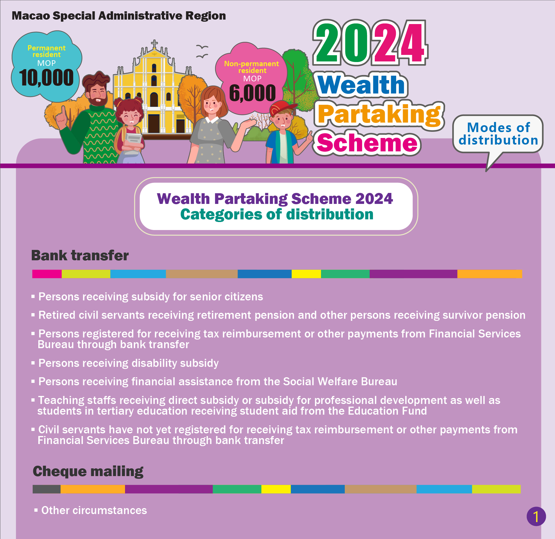 The subsidy will be distributed through bank transfer to the individuals who meet the requirements of the Wealth Partaking Scheme 2024, including: (1) persons receiving subsidy for senior citizens; (2) retired civil servants receiving retirement pension and other persons receiving survivor pension; (3) persons registered for receiving tax reimbursement or other payments from Financial Services Bureau through bank transfer; (4) persons receiving disability subsidy; (5) persons receiving financial assistance from the Social Welfare Bureau; (6) teaching staffs receiving direct subsidy or subsidy for professional development as well as students in tertiary education receiving student aid from the Education Fund; and (7) civil servants have not yet registered for receiving tax reimbursement or other payments from Financial Services Bureau through bank transfer.