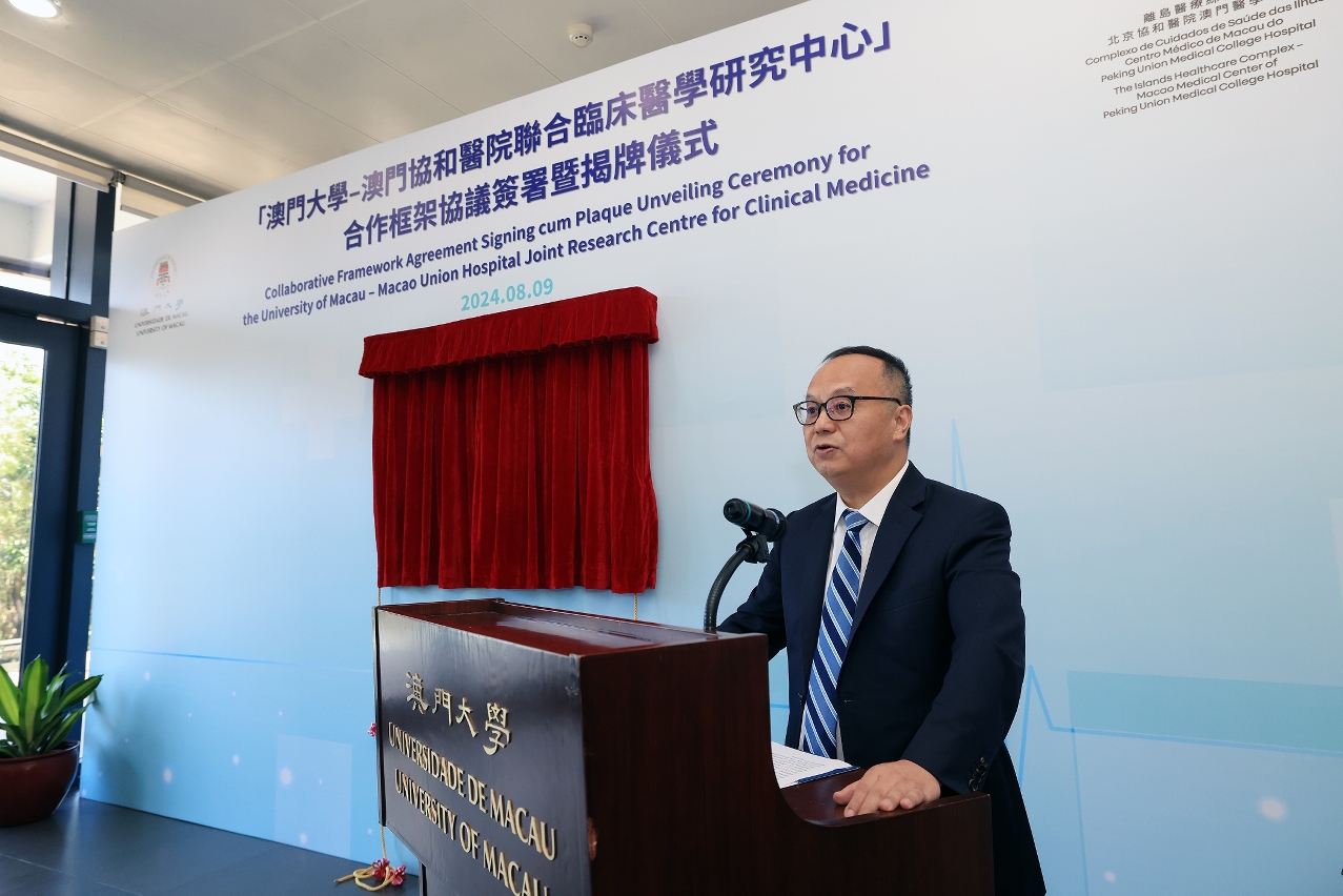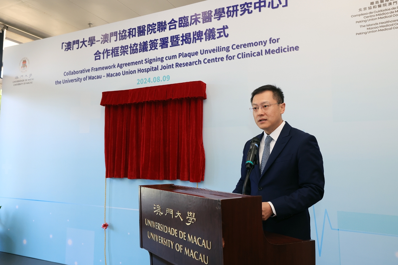 The University of Macau (UM) and the Islands Healthcare Complex – Macao Medical Center of Peking Union Medical College Hospital (Macao Union Hospital) today (9 August) signed a collaborative framework agreement and held a plaque unveiling ceremony for the University of Macau–Macao Union Hospital Joint Research Centre for Clinical Medicine. The joint research centre will actively promote innovative research in the fields of biomedicine, clinical medicine, critical diseases, Chinese medicine and ‘big health’, and train professionals in clinical medicine and other fields.