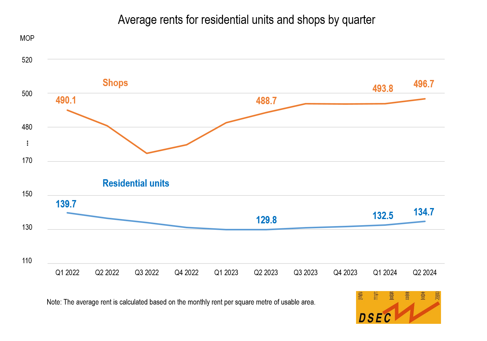 In comparison with the second quarter of 2023, the average rent for residential units in Macao grew by 3.8%; the average rents for shops and industrial units climbed by 1.6% and 1.5% respectively, whereas the average rent for office units fell by 2.1%.