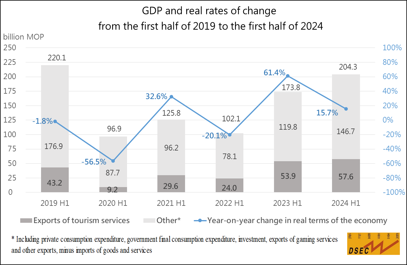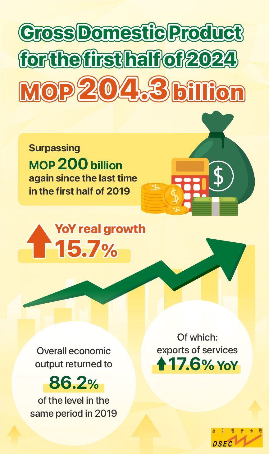 GDP increased by 15.7% year-on-year in real terms in the first half of 2024, surpassing MOP200 billion again since the last time in the first half of 2019
