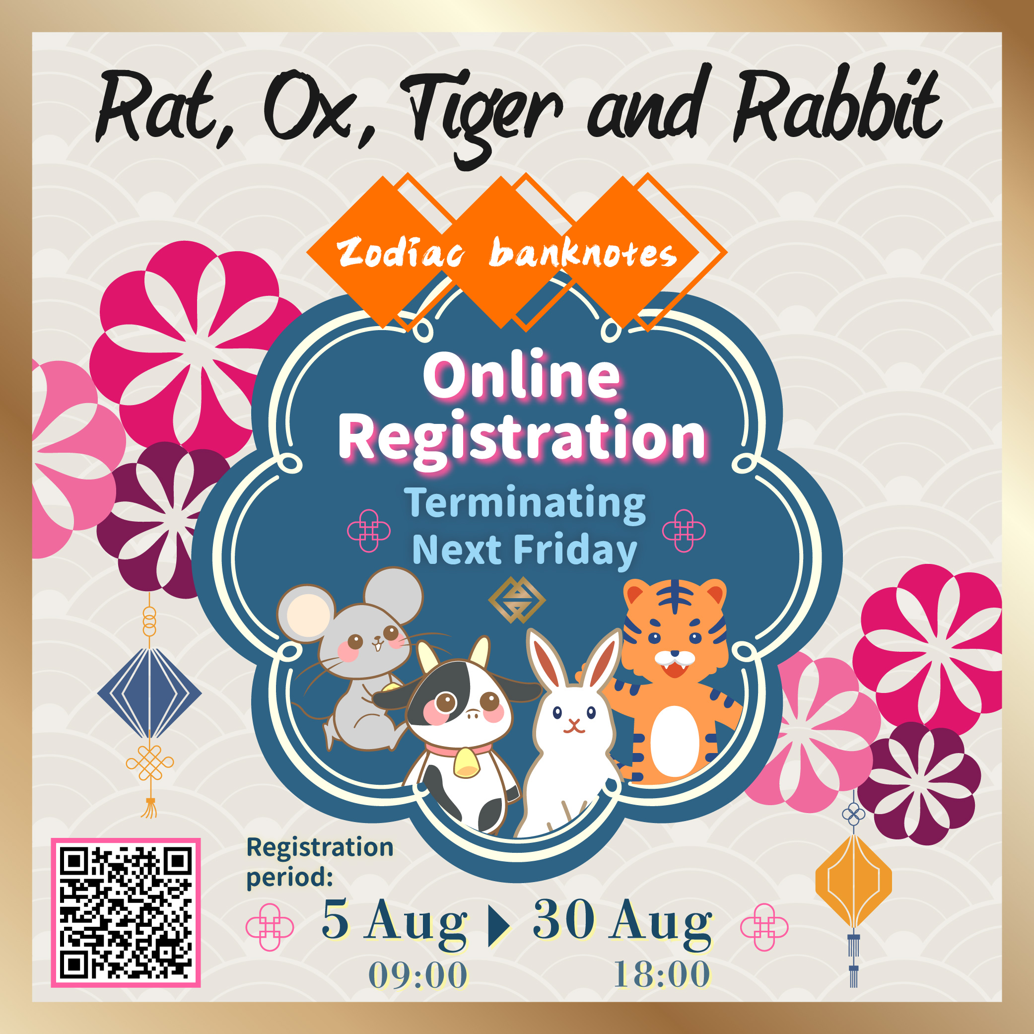The online registration period for the exchange of four previously issued Zodiac Banknotes (including the Rat, Ox, Tiger and Rabbit Zodiac Banknotes) will end at 6:00pm on 30 August 2024 (Friday). The Monetary Authority of Macao would like to remind those citizens who are interested in exchanging for the said banknotes to complete the registration process as soon as possible.