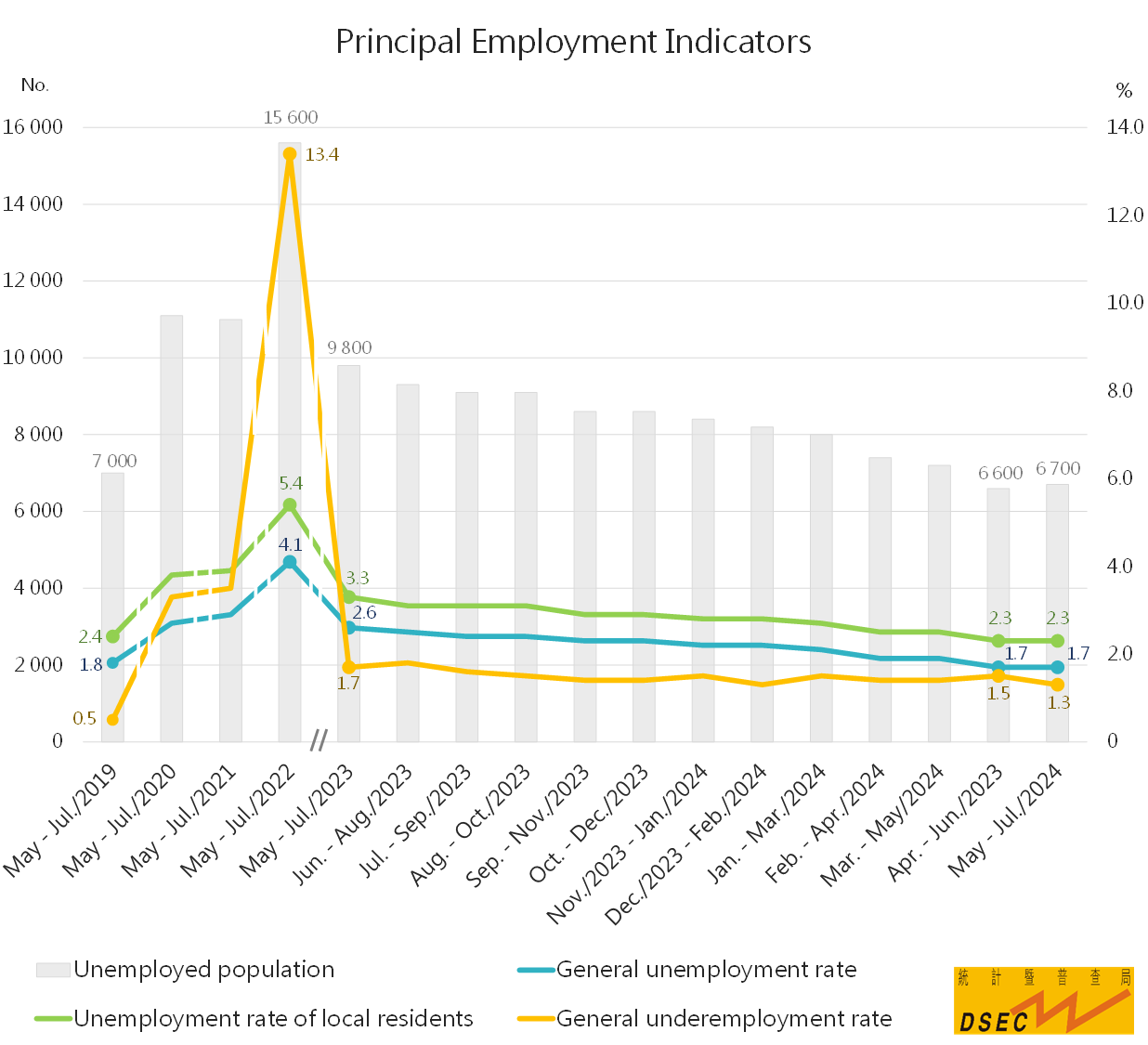 Information from the Statistics and Census Service (DSEC) indicated that the general unemployment rate and the unemployment rate of local residents for May - July 2024 remained at low levels of 1.7% and 2.3% respectively. Both indicators stayed the same as in the previous period (April - June 2024). Meanwhile, the underemployment rate dropped by 0.2 percentage points to 1.3%.