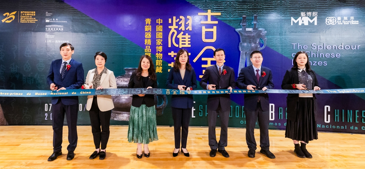 Jointly organised by the Cultural Affairs Bureau of the Macao SAR Government and the National Museum of China, and implemented by the Macao Museum of Art (MAM), the exhibition “The Splendour of Chinese Bronzes: Masterpieces from the National Museum of China” was inaugurated on 6 September, on the 4th floor of the MAM. The opening ceremony was officiated by the Secretary for Social Affairs and Culture of the Macao SAR Government, Ao Ieong U; the Chief of the Office of the Secretary for Social Affairs and Culture of the Macao SAR Government, Ho Ioc San; the Deputy Director of the Department of Publicity and Culture of the Liaison Office of the Central People’s Government in the Macao SAR, Yin Rutao; the President of the Cultural Affairs Bureau of the Macao SAR Government, Leong Wai Man; the Deputy Director of the National Museum of China, Zhang Weiming; the Deputy Director of the Macao Government Tourism Office, Hoi Io Meng; and the Director of the Macao Museum of Art, Un Sio San.