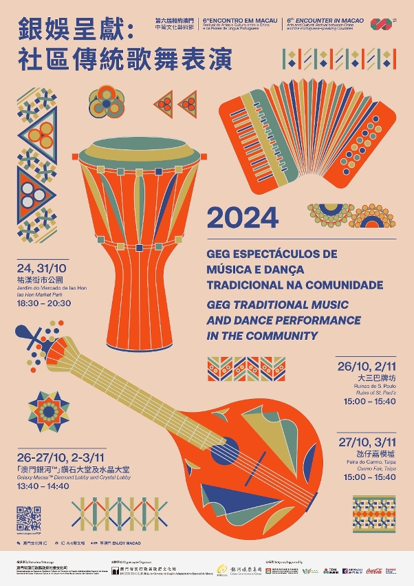 For the programme of the “GEG Traditional Music and Dance Performance in the Community” and details, please visit the webpage of the “Encounter in Macao – Arts and Culture Festival between China and Portuguese-speaking Countries” at www.icm.gov.mo/FCP, the “IC Art” page on Facebook or WeChat official account “IC_Art_Macao”.
