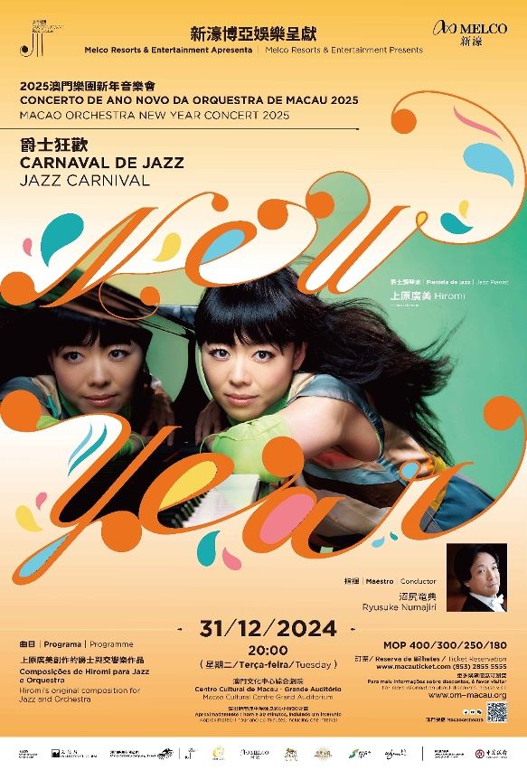 The concert “Jazz Carnival – Macao Orchestra New Year Concert 2025” is title-sponsored by Melco Resorts & Entertainment. Tickets are now on sale through the Macau Ticketing Network, priced at MOP400, MOP300, MOP250 and MOP180. The public can purchase tickets through the Macau Ticketing Network. 24-hour ticketing hotline: 2855 5555; ticketing website: www.macauticket.com.