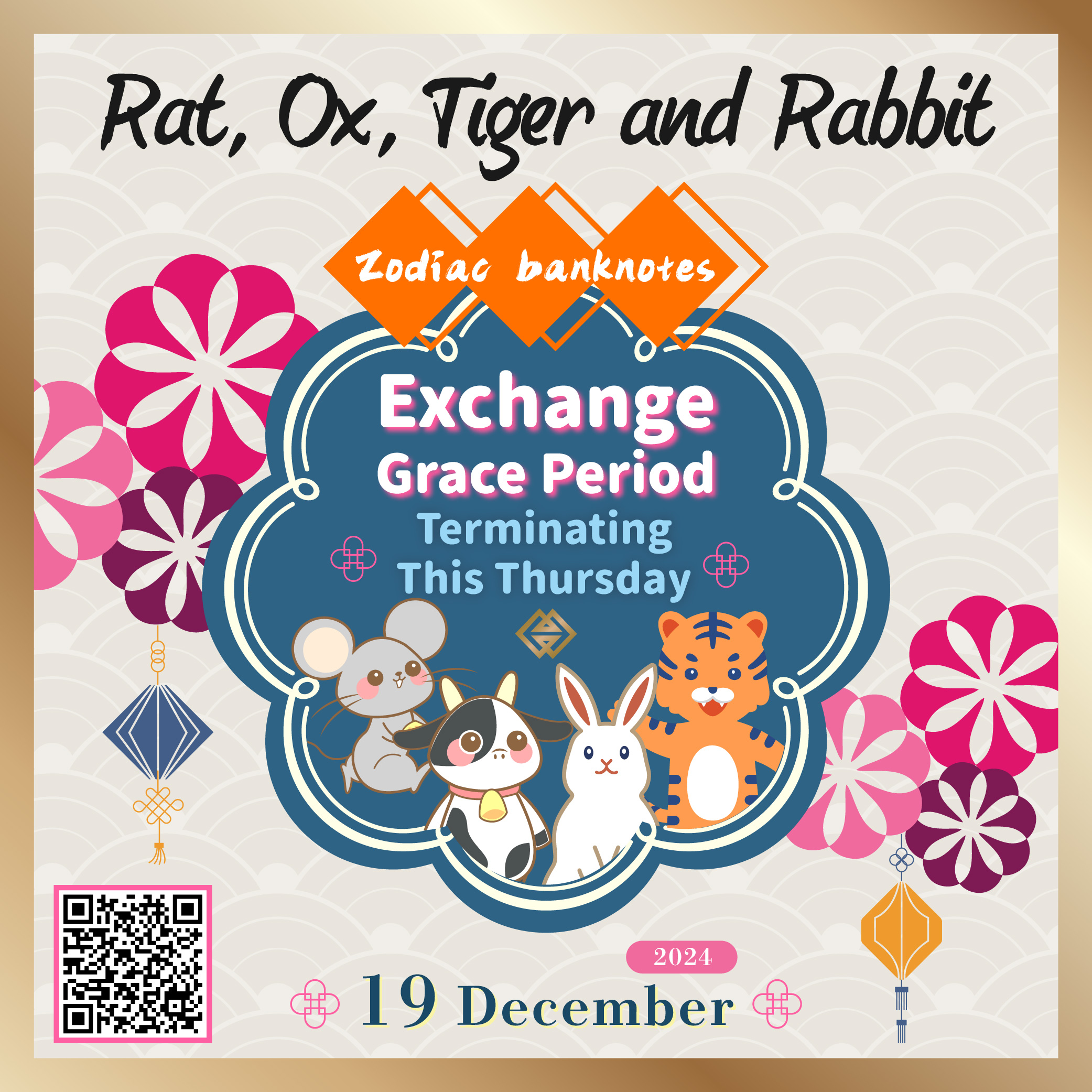 The grace period for four previously issued Zodiac Banknotes (including the Rat, Ox, Tiger and Rabbit Zodiac Banknotes) will end on 19 December 2024 (Thursday). The Monetary Authority of Macao would like to remind those registrants who have not yet conducted the note exchange to exchange for their subscribed notes at their previously selected bank on or before this Thursday.