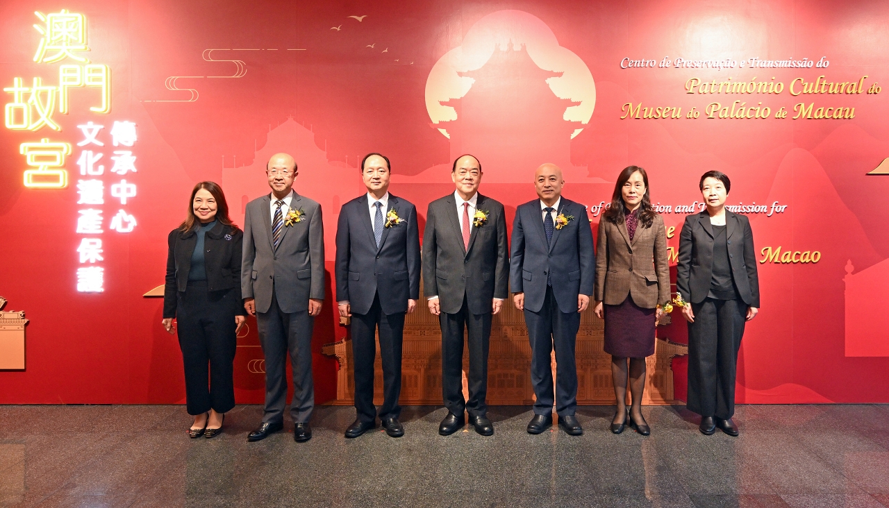 In order to celebrate the 75th anniversary of the founding of the People’s Republic of China and the 25th anniversary of the establishment of the Macao SAR, as well as to strengthen the preservation, restoration, education and promotion of cultural heritage in Macao and contribute to the establishment of Macao as “a base for exchange and cooperation with Chinese culture as the mainstream and the coexistence of different cultures”, the Centre of Preservation and Transmission for Cultural Heritage of the Palace Museum in Macao, jointly established by the Macao SAR Government and the Ministry of Culture and Tourism of the People’s Republic of China, was inaugurated today (28 November), with a plaque unveiling ceremony jointly hosted by the Chief Executive of the Macao SAR Government, Ho Iat Seng, and the Director of the Palace Museum, Wang Xudong. The ceremony was also attended by the Director of the Liaison Office of the Central People’s Government in the Macao SAR, Zheng Xinchong; the Commissioner of the Ministry of Foreign Affairs of the People’s Republic of China in the Macao SAR, Liu Xianfa; the Secretary for Social Affairs and Culture of the Macao SAR Government, Ao Ieong U; and the President of the Cultural Affairs Bureau of the Macao SAR Government, Leong Wai Man.