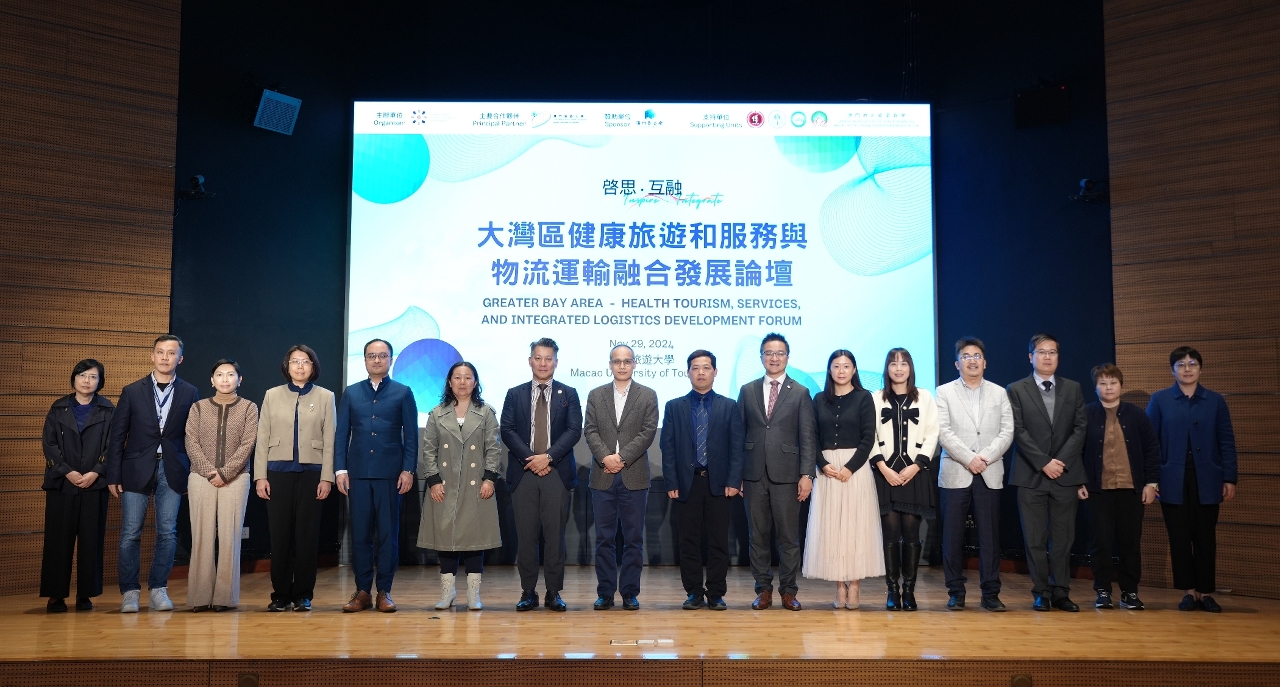 In recent years, the “Outline Development Plan for the Guangdong-Hong Kong-Macao Greater Bay Area” and the “Overall Plan for the Construction of the Hengqin Guangdong-Macao Deep Cooperation Zone,” issued by the State Council, have provided important guidance on the development of leisure tourism and the health industry. To celebrate the 25th anniversary of the establishment of the Macao Special Administrative Region, the “Greater Bay Area Health Tourism, Services, and Integrated Logistics Development Forum”, hosted by the Chartered Institute of Logistics and Transport in Macao and co-organised by the Macao University of Tourism (UTM) as the principal partner, was successfully held at UTM’s Mong-Há campus on 29 November. The event also featured an online livestream, attracting over 120 participants on-site, including representatives from government departments, industry experts, associations, and universities. The forum covered multiple integrated fields such as supply chain, transportation, healthcare, wellness, services, and tourism.