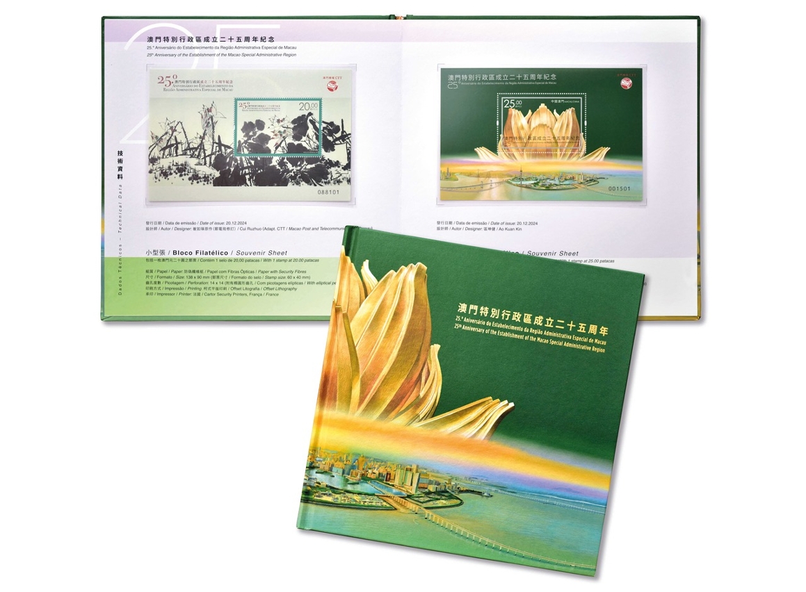 In celebration of the 25th anniversary of the reunification of Macao with the Motherland, Macao Post and Telecommunications will issue a thematic pack under the theme "25th Anniversary of the Establishment of the Macao Special Administrative Region" on 20th December 2024. The pack comprises 7 series of stamps and souvenir sheets related to the reunification of Macao with the Motherland, including the establishment of the Macao SAR, and the 1st, 5th, 10th, 15th, 20th and 25th anniversaries.