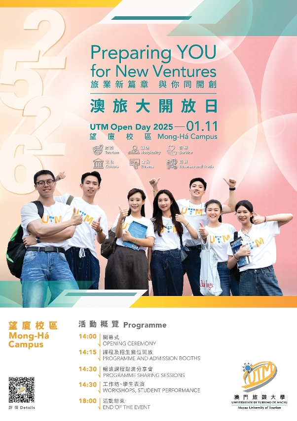 As the registration for the Joint Admission Examination for Macao Four Higher Education Institutions starts, the Macao University of Tourism (UTM) will hold its 2025 Open Day on 11 January from 2pm to 6pm at the Mong-Há Campus. Through various activities, UTM welcomes the public, especially secondary school students and their parents, to learn about the latest admission information and programme characteristics, offering a glimpse into campus life and culture.