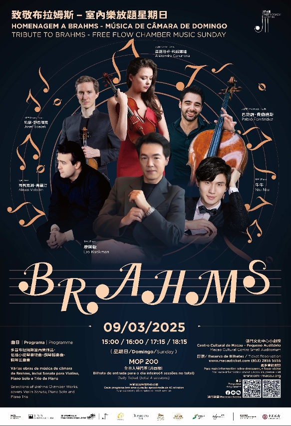 A marathon of four sessions of Brahms' chamber music will be held at 3pm on 9 March at the Macao Cultural Centre Small Auditorium, featuring a number of internationally renowned musicians, including Lio Kuokman, Alexandra Conunova, Pablo Ferrández, Josef Špaček, Alexei Volodin, and Zhang Shengliang (“Niu Niu”). The programme includes the complete set of Brahms' Violin Sonatas, Piano Solos, Hungarian Dances, and the Piano Concerto No. 1 in B major, inviting the audience to immerse themselves in the melodic universe of the composer.