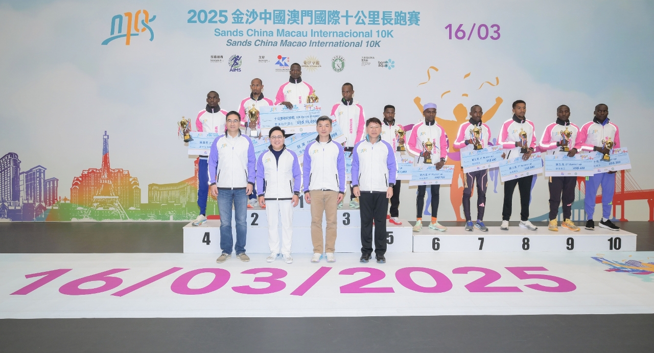 Organized by the Sports Bureau, Sands China Ltd. and the General Association of Athletics of Macau, the 2025 Sands China Macao International 10K took place today (16 March). The 10K race started at 7 a.m. and the Fun Run started at 7:45 a.m. at Sai Van Lake Square. Kenyan athletes Vincent Kibet Langat and Betty Sigei were crowned the overall champions in the men’s and women’s 10K, with both setting a new race record.