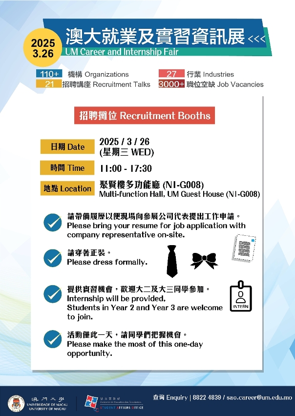 The fair will take place in the Multi-function Hall of the UM Guest House (N1-G008), from 11:00am to 5:30pm (last entry at 5:00pm). Companies and organisations will set up recruitment booths at the venue. All students are welcome to bring their personal information and dress formally to explore potential career opportunities at the fair. For enquiries, please contact the UM Career Development Centre at +853 8822 4839 or email sao.career@um.edu.mo.