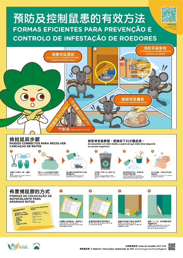 The “citywide cleanup campaign” needs to start from individual homes. From 1 April to 31 May, the interdepartmental team will tour various neighbourhoods to set up photo exhibitions to introduce environmental hygiene information. On Saturdays and Sundays during the above-mentioned period, there will be consulting street kiosks on site to provide the public with technical instructions on rodent control. Booth games will also be set up at the venues to promote information on rodent prevention and mosquito control, prohibition on feeding birds and stray animals indiscriminately, proper disposal of pet excrement, and disposal methods of domestic solid waste. Details of the event can be found by scanning the QR code on the poster or browsing the Environment Information Webpage (www.iam.gov.mo/macaohygiene).