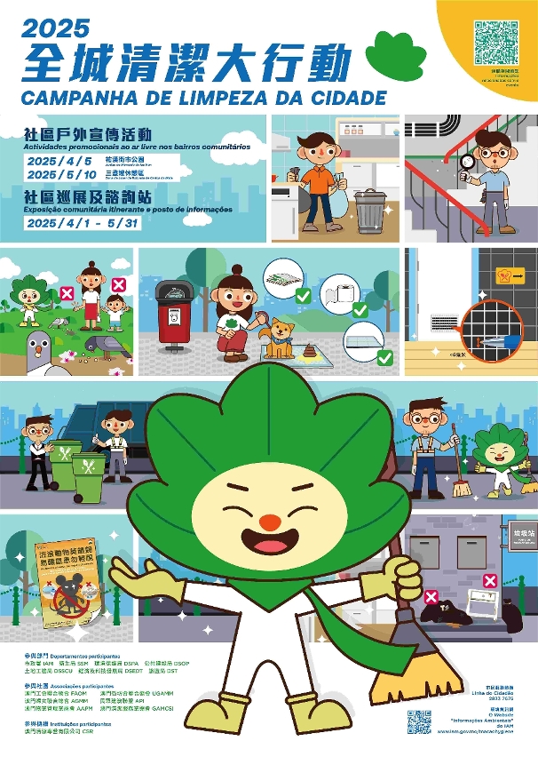 The inauguration ceremony of the citywide cleanup campaign will be held on the afternoon of 5 April at Iao Hon Market Park, participated by representatives from the Municipal Affairs Bureau (IAM), the Health Bureau, the Environmental Protection Bureau, Public Works Bureau, Land and Urban Construction Bureau, Economic and Technological Development Bureau, Macao Government Tourism Office and other departments and associations. After the inauguration ceremony, multiple teams will be formed to “enter the neighbourhoods” and arrive at nearby leisure areas for cleaning. The teams will distribute promotional materials to the public, building management entities, residents of the “three no’s” low-rise buildings, restaurant managers, etc. along the way to enhance public awareness of cleanliness and hygiene management, and encourage them to work together for rodent and mosquito prevention. At the same time, relevant functional departments will go to food establishments, food processing plants and construction sites to urge the people in charge to adopt effective food and solid waste treatment measures, maintain cleanliness and environmental hygiene, and prevent pest and rodent infestation in the community. In addition, another community cleaning and publicity event will be held on 10 May in the area of Rotunda de Carlos da Maia and San Kio.