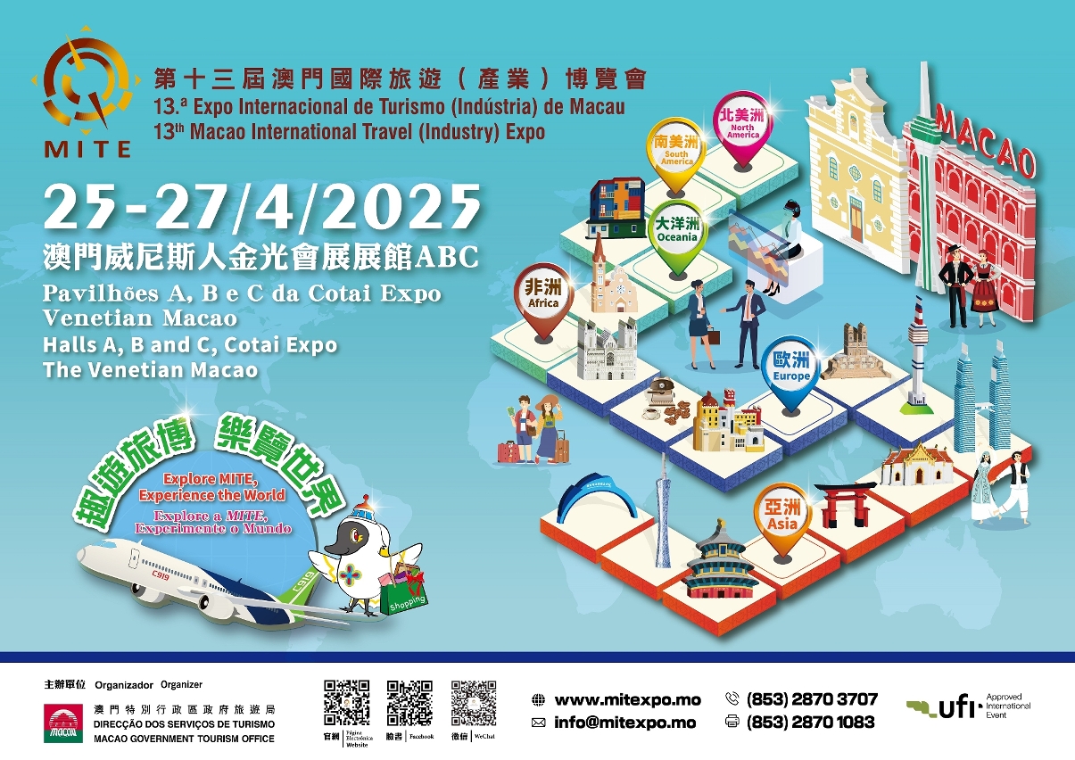The 13th Macao International Travel (Industry) Expo (referred to as the “Expo” or “MITE”) will take place at Halls A, B and C, Cotai Expo of the Venetian Macao from 25 – 27 April 2025. Under the theme of “Explore MITE, Experience the World”, MITE will present six brand-new major highlights and bring together tourism and related industry participants from near and far. To date, nearly 600 exhibitors from more than 60 countries and regions and around 500 hosted buyers from worldwide are participating in the Expo. The number of international exhibitor booths increases by nearly 50%. The figures bespeak the effective role of MITE as a platform that creates business opportunities in international tourism. It is set to make a great impact as a prestigious international travel fair that fosters regional and international exchange and cooperation in tourism, contributing to forging a platform for Macao’s high-level opening up to the world.