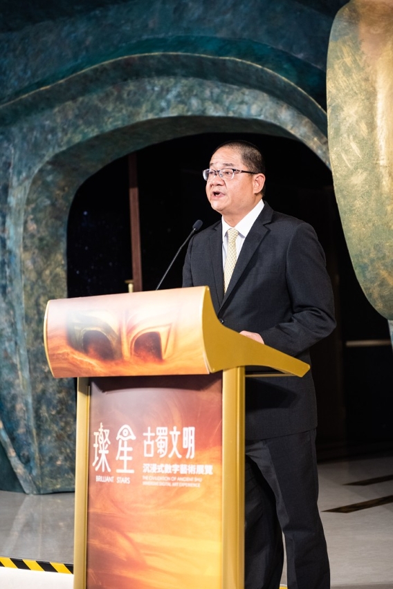 Wu Zhiliang, Su Kun, and Liu Juncai delivered speeches during the ceremony, followed by a ribbon-cutting ceremony officiated by Huang Liuquan, Kenneth Feng, Leong Wai Man and Xu Bei, marking the inauguration of the “BRILLIANT STARS - THE CIVILIZATION OF ANCIENT SHU Immersive Digital Art Experience”.
