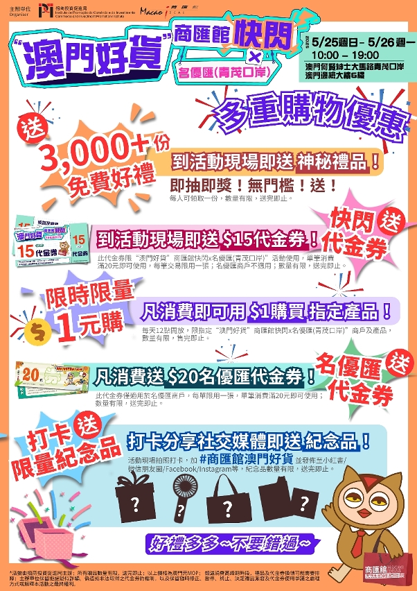 At the venue, over 3,000 gifts will be given out on site, and there will be a range of exclusive offers, including limited-time MOP-1 purchases, Pop-up vouchers, discounted products, YoBuy merchant vouchers, souvenirs, and more special offers while stocks last. Residents and visitors are cordially invited to “YoBuy” on the 6th floor of Qingmao Port Building, Avenida do Comendador Ho Yin, to explore Macao’s premium goods from 10am to 7pm on 25 and 26 May.