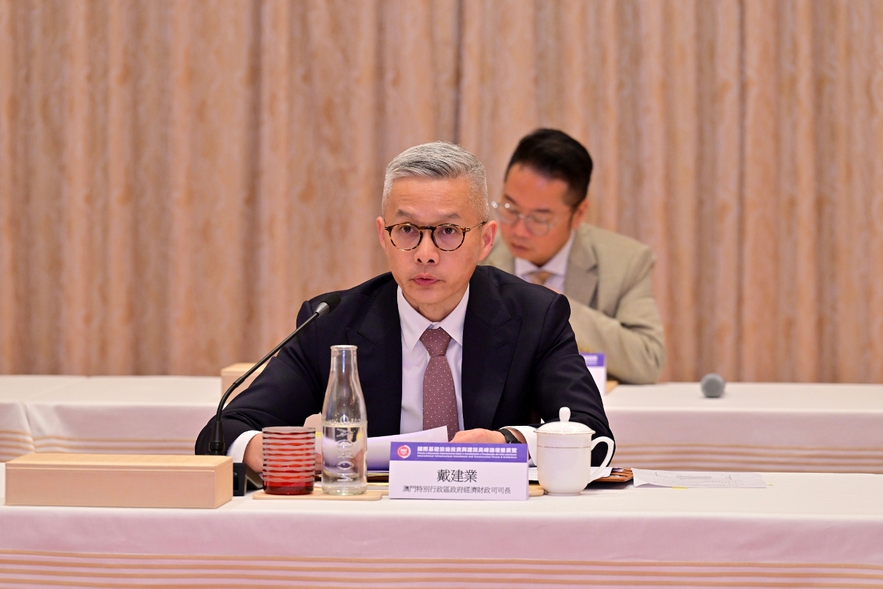 • Secretary for Economy and Finance of the Macao Special Administrative Region Government Tai Kin Ip delivers a speech at the 6th Meeting of Steering Committee of IIICF