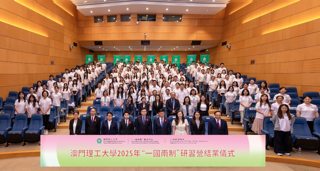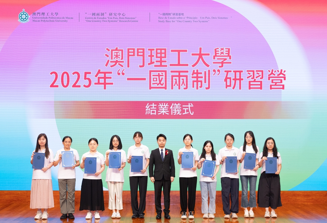 To deepen understanding among faculty and students from Mainland universities on the successful practice of “One Country, Two Systems” with Macao characteristics and to experience Macao’s development since its return to the motherland, Macao Polytechnic University (MPU) hosted the “One Country Two Systems” Study Camp, which received an enthusiastic response. The closing ceremony of the “One Country Two Systems” Study Camp 2025 was held at the MPU Auditorium, where 153 teachers and students from 11 Mainland universities completed their study journey. Officiating guests included Teng Sio Hong, Deputy Director of the Education and Youth Development Bureau (DSEDJ) of the Macao SAR Government; Marcus Im, Rector of MPU; Cheang Hong Kuong, President of the Chinese Educators’ Association of Macau; Lao Lai Mui, President of the Macao Catholic Schools Association; Heong Mui, President of the Macau Civil Service Education Association; and Leng Tiexun, Director of the “One Country Two Systems” Research Centre of MPU. They jointly presented completion certificates to participants amid a vibrant atmosphere.