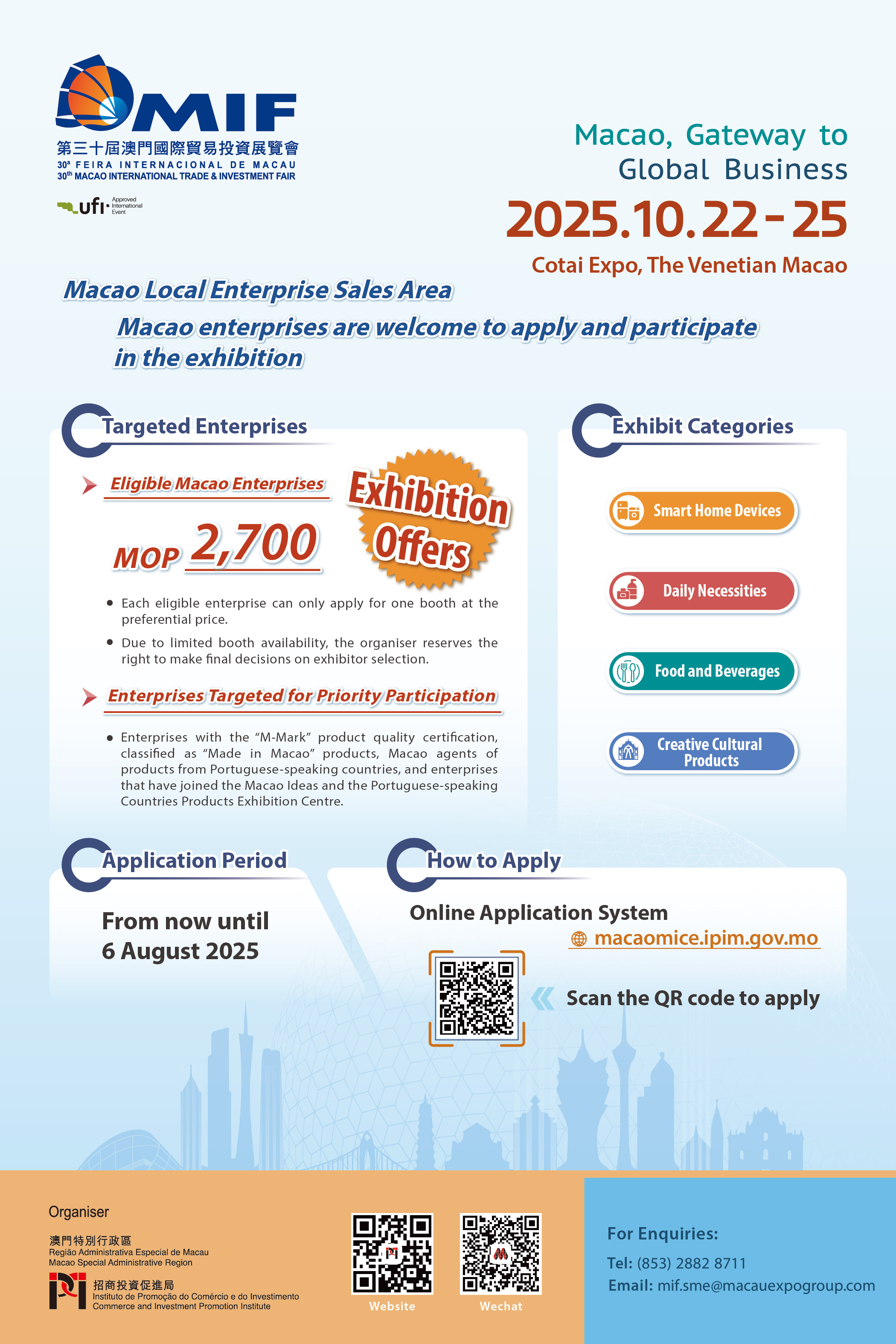 The 30th Macao International Trade & Investment Fair (30th MIF), organised by the Commerce and Investment Promotion Institute (IPIM) of the Macao Special Administrative Region under the theme “Macao, Gateway to Global Business”, will be held from 22 to 25 October 2025 (Wednesday to Saturday). To support and encourage Macao enterprises in exploring domestic and international markets, the organiser is offering a special privilege for local enterprises wishing to exhibit at the “Macao Local Enterprise Sales Area”. Eligible applicants can enjoy an 80% discount, reducing the exhibition fee to MOP2,700. Interested enterprises may submit applications via the “Online Application System for Event Projects” ( macaomice.ipim.gov.mo ) on IPIM’s website from now until 6 August.