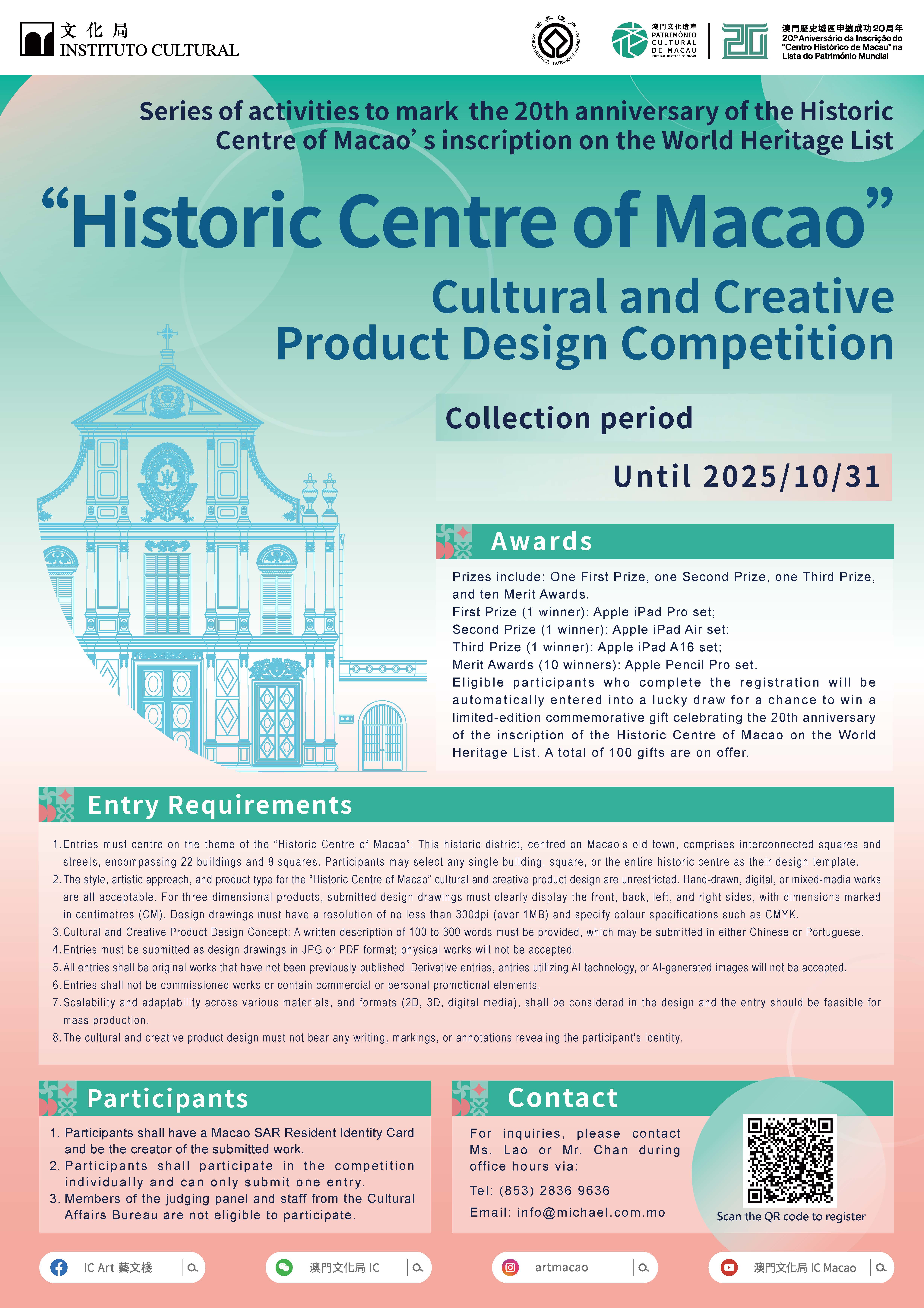 Applicants of the “Cultural and Creative Product Design Competition” must be Macao residents, of any age, and must be the creators of the entries. Each person can only submit one entry. Interested parties can register through the “Activity Applications” of the Macao One Account (activity.mo.gov.mo/activity-h5/activity-list-web) before 31 October 2025 and upload information on their entries. Late registration will not be accepted. 13 winning entries will be selected in the Competition. The first, second and third prize winners will receive a certificate and a tablet computer, while 10 Merit Awards winners will receive a certificate and a digital stylus. Eligible participants who complete the registration will be automatically entered into a lucky draw and stand a chance to win a limited-edition commemorative souvenir celebrating the 20th anniversary of the inscription of the Historic Centre of Macao on the World Heritage List, 100 souvenirs are available. The list of winners will be announced on IC’s website in late November 2025. The competition regulations can be obtained and downloaded at the IC’s website. All residents are welcome to participate.