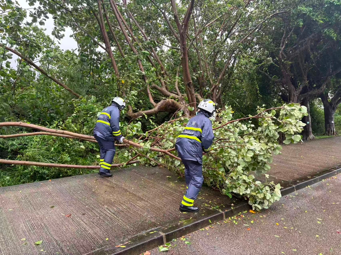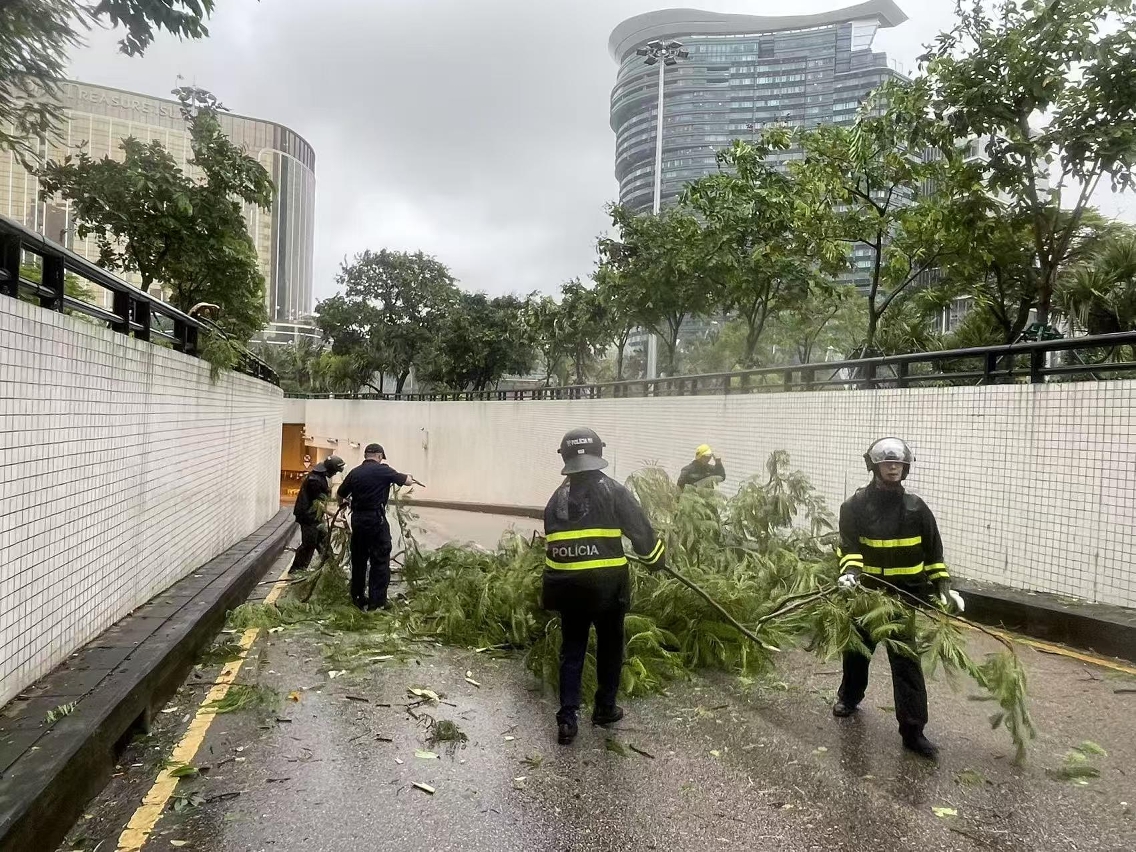 • The Fire Services Bureau and the Public Security Police Force personnel clear fallen trees from the road.