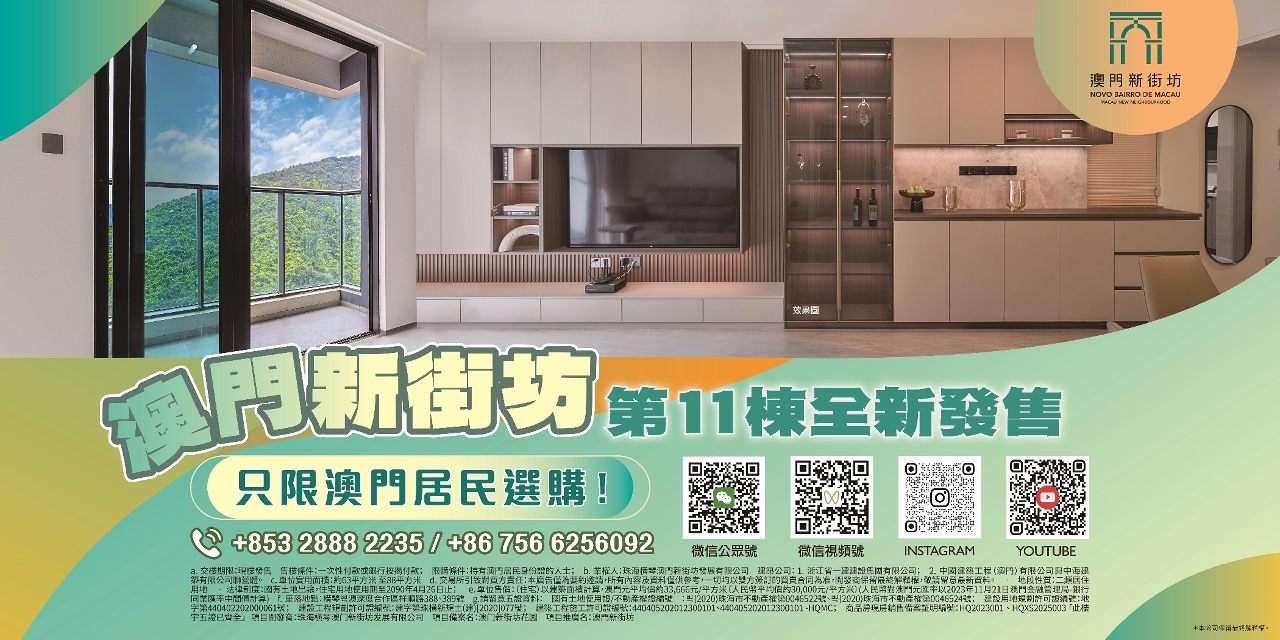 On the same day, Macau New Neighbourhood (MNN) will launch a “Massive Triple Treat” for eligible new buyers, offering discounts on parking spaces, renovations, and electronic appliances. For details on the offers, please contact the sales centre (Tel: +853 2888 2235 / +86 756 6256092).