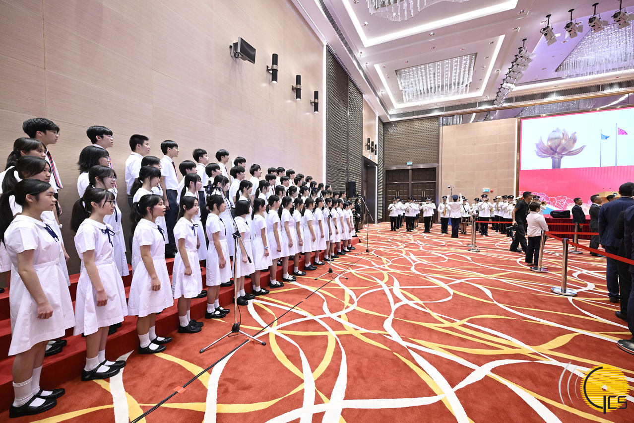 • The Macao Police Band and local middle school students play and sing the national anthem at the reception hosted by the Macao Special Administrative Region Government to celebrate the 76th anniversary of the founding of the People's Republic of China.