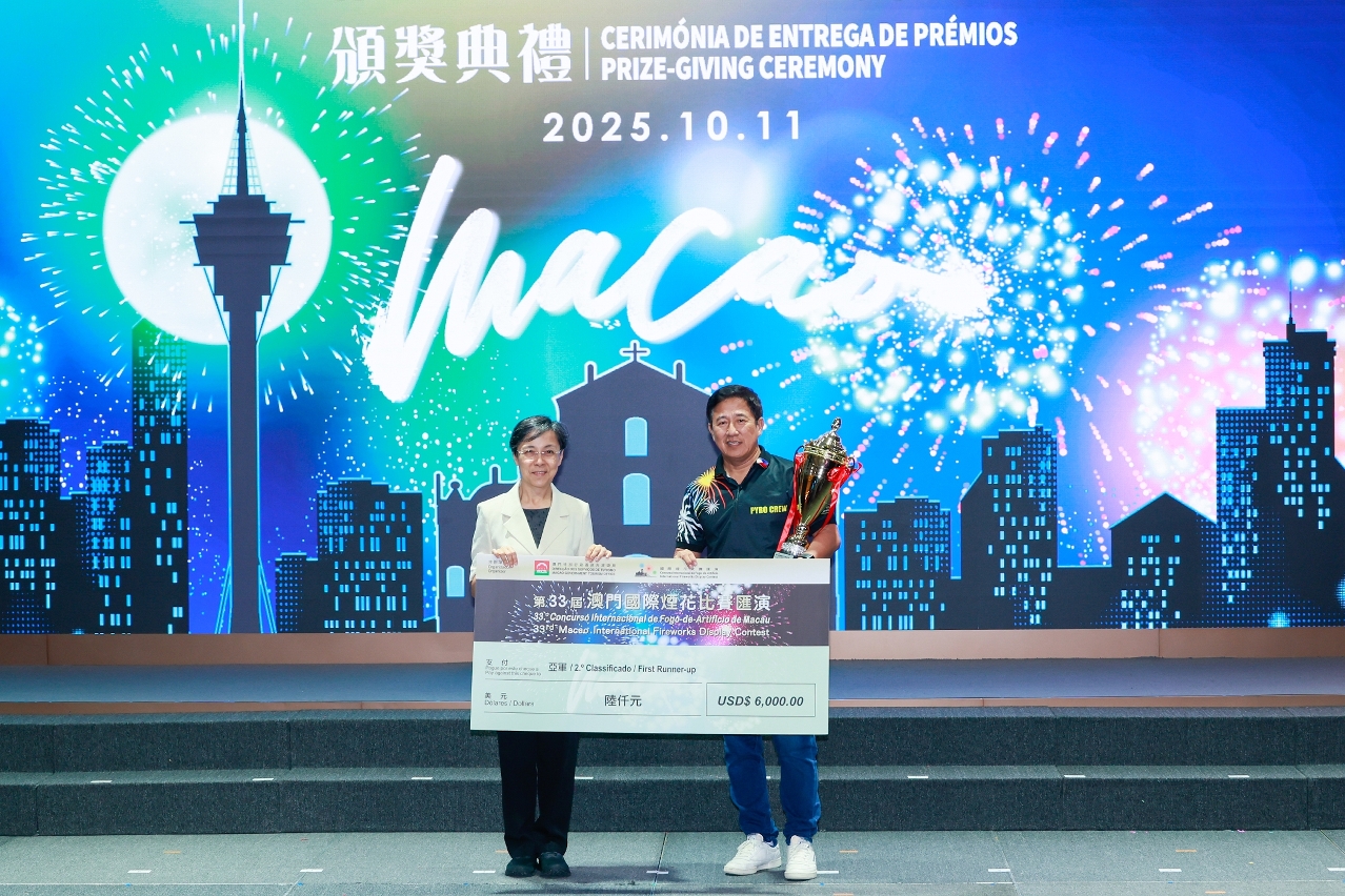 The prize-giving ceremony took place right after the last two fireworks shows. Secretary for Economy and Finance, Tai Kin Ip, and MGTO Director Maria Helena de Senna Fernandes attended the ceremony together with other guests. Senna Fernandes expressed in her remarks that MGTO has striven to invite outstanding pyrotechnic companies from around the world to join the Contest. Despite that the two finale shows were rescheduled for tonight owing to weather conditions, the fireworks companies presented ten splendid extravaganzas of light and sound on five evenings. Contest participants had the opportunity to connect and deepen exchange with their counterparts from worldwide, which manifested Macao’s strengths as an international exchange platform. She expressed hope that the Contest will continue to bring out Macao’s diverse charm of “tourism + events” and enrich the city’s dynamic as a world centre of tourism and leisure.