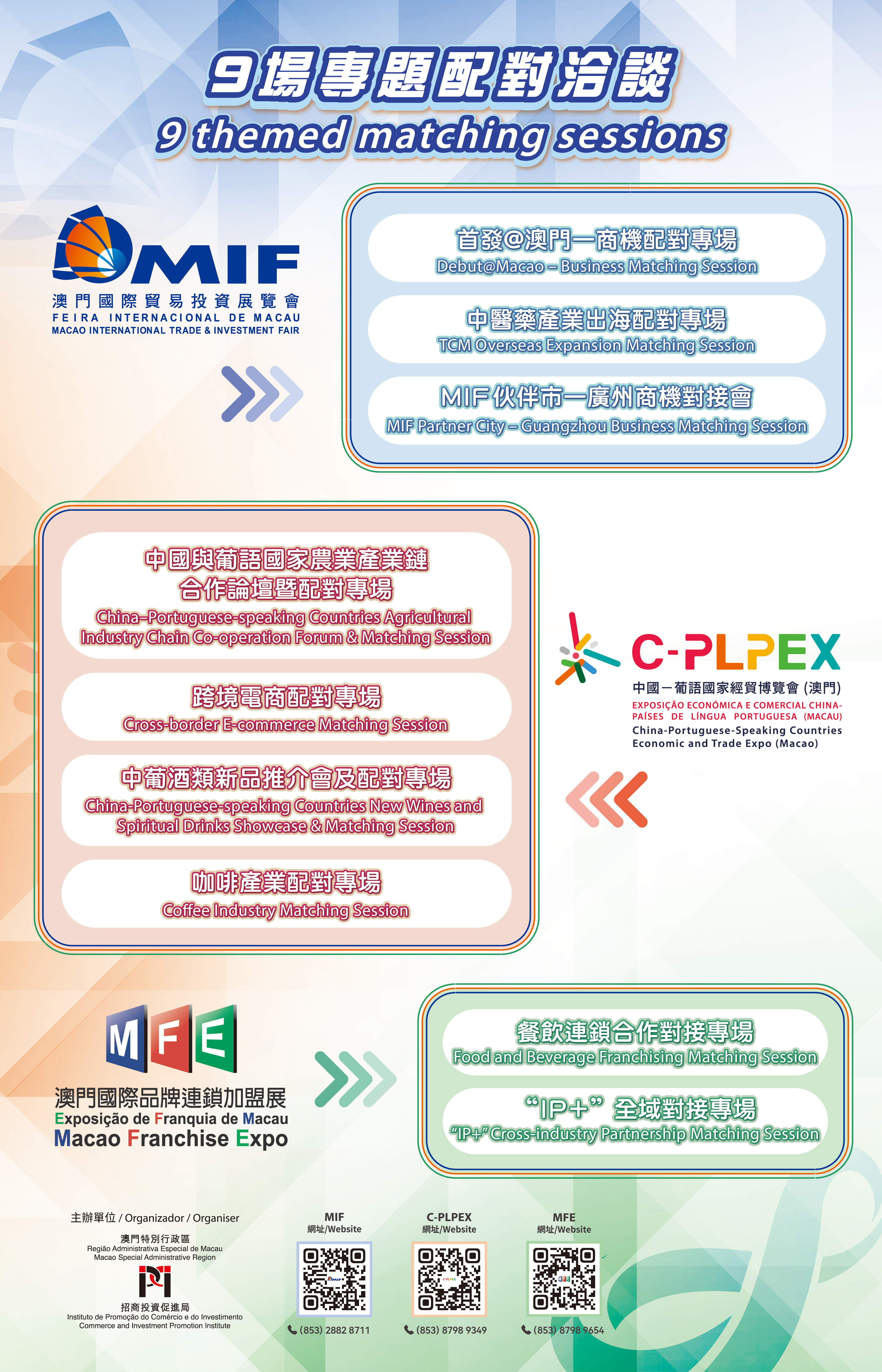 To participate in the themed matching sessions and other activities during the three events, please visit the official websites at www.cplpex.mo, www.mif.com.mo, or www.mfe.mo. You may also call the hotline for the 2nd C-PLPEX on (853) 2822 8289, the hotline for the 30th MIF on (853) 2882 8711, the hotline for the 2025MFE on (853) 8798 9654, or follow the WeChat account: MICE_IPIM.